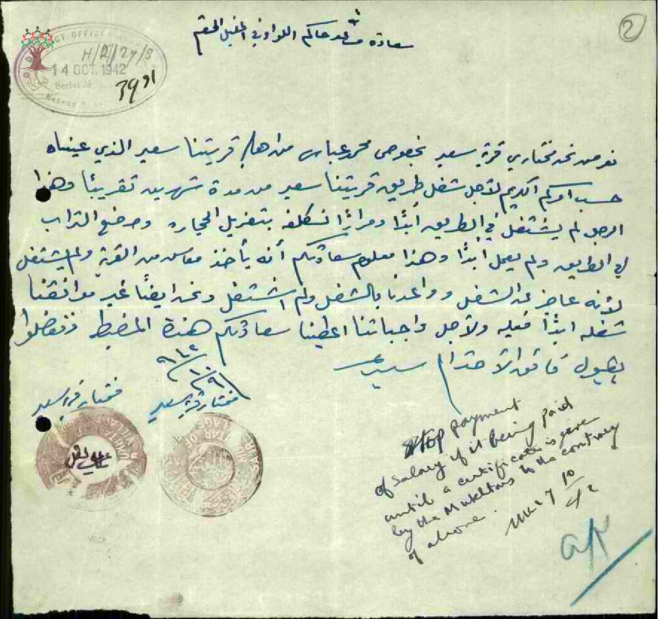 رسالة من مختاري قرية سعير إلى مساعد حاكم لواء الخليل بخصوص محمد عباس