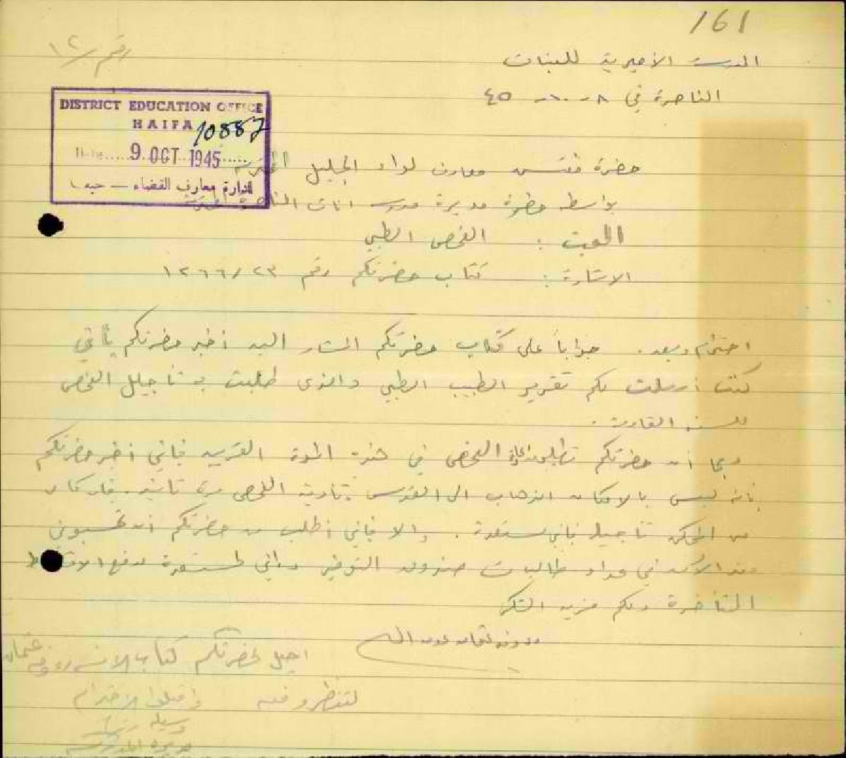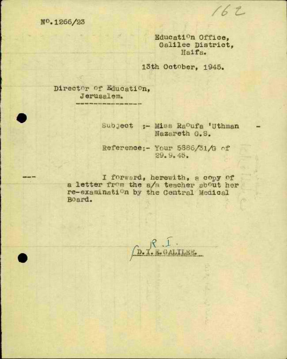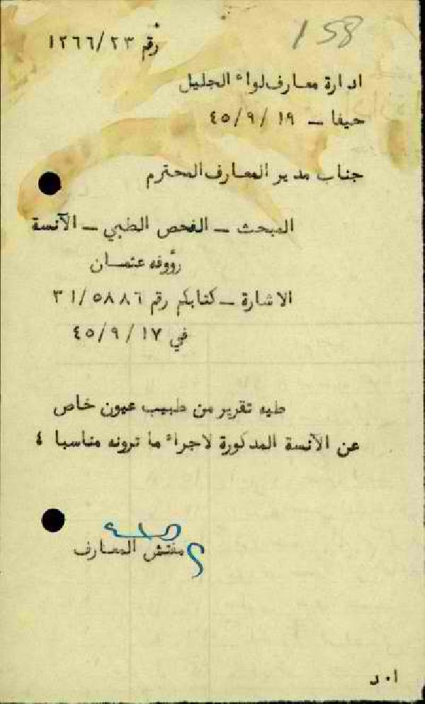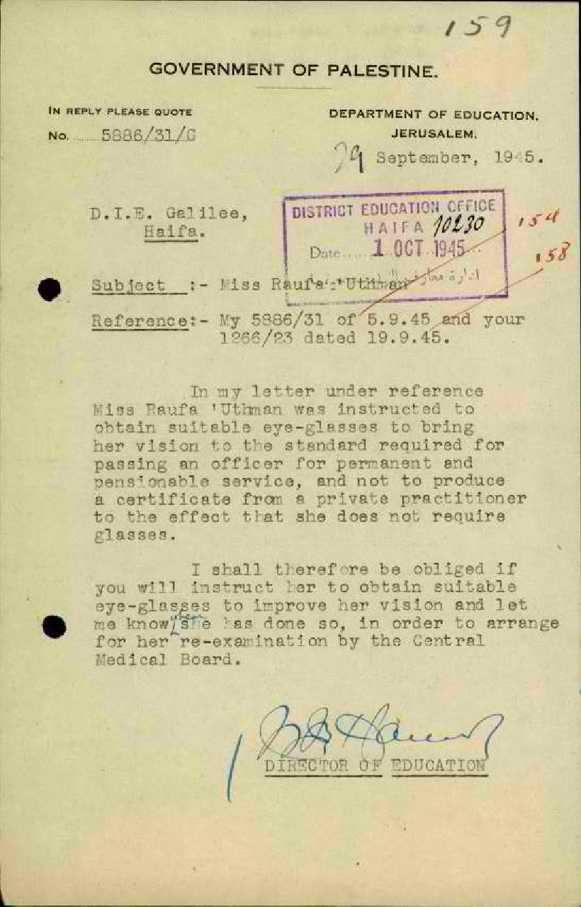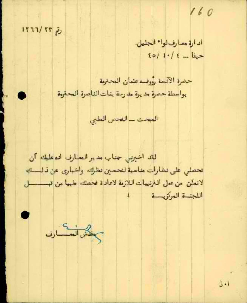 مجموعة رسائل بين المعلمة رؤوفة عون الله وادارة المعارف بخصوص ضرورة ارتدائها للنظارات