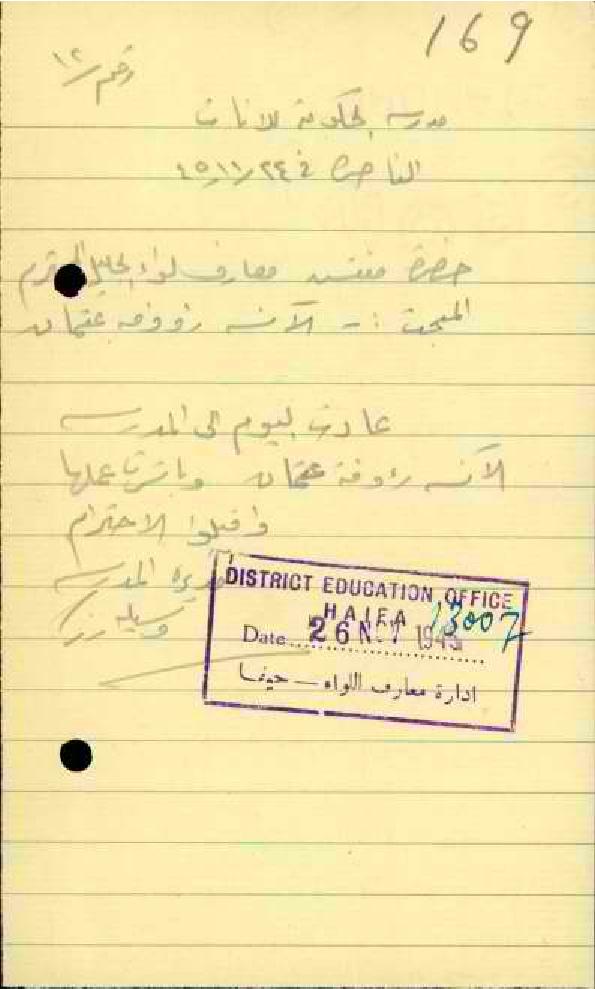 رسالة من مديرة مدرسة الناصرة الى مفتش المعارف بخصوص عودة المعلمة رؤوفة عون الله الى العمل