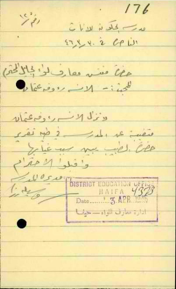مجموعة رسائل من مديرة مدرسة الناصرة الى مفتش المعارف بخصوص تغيب المعلمة رؤوفة عون الله