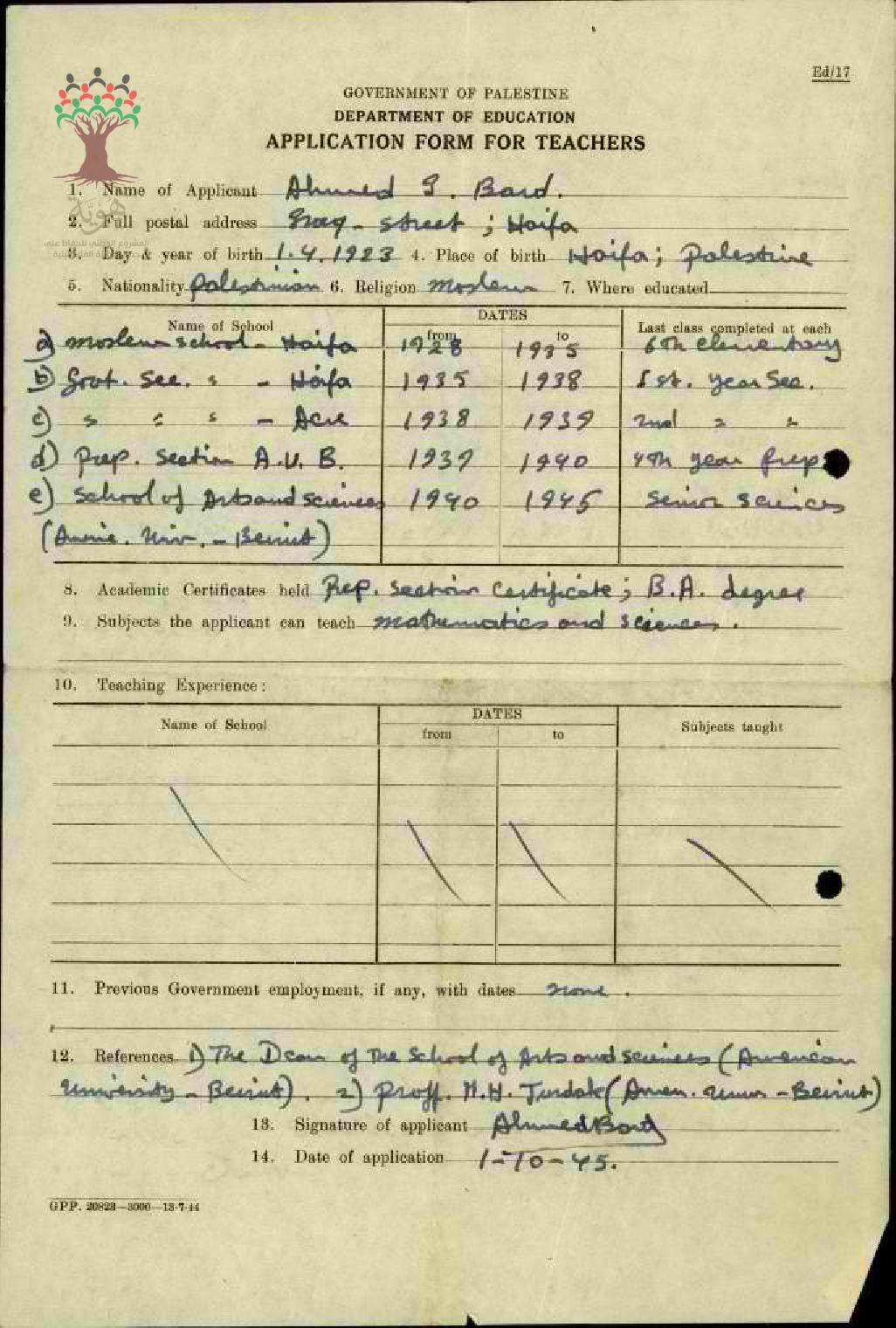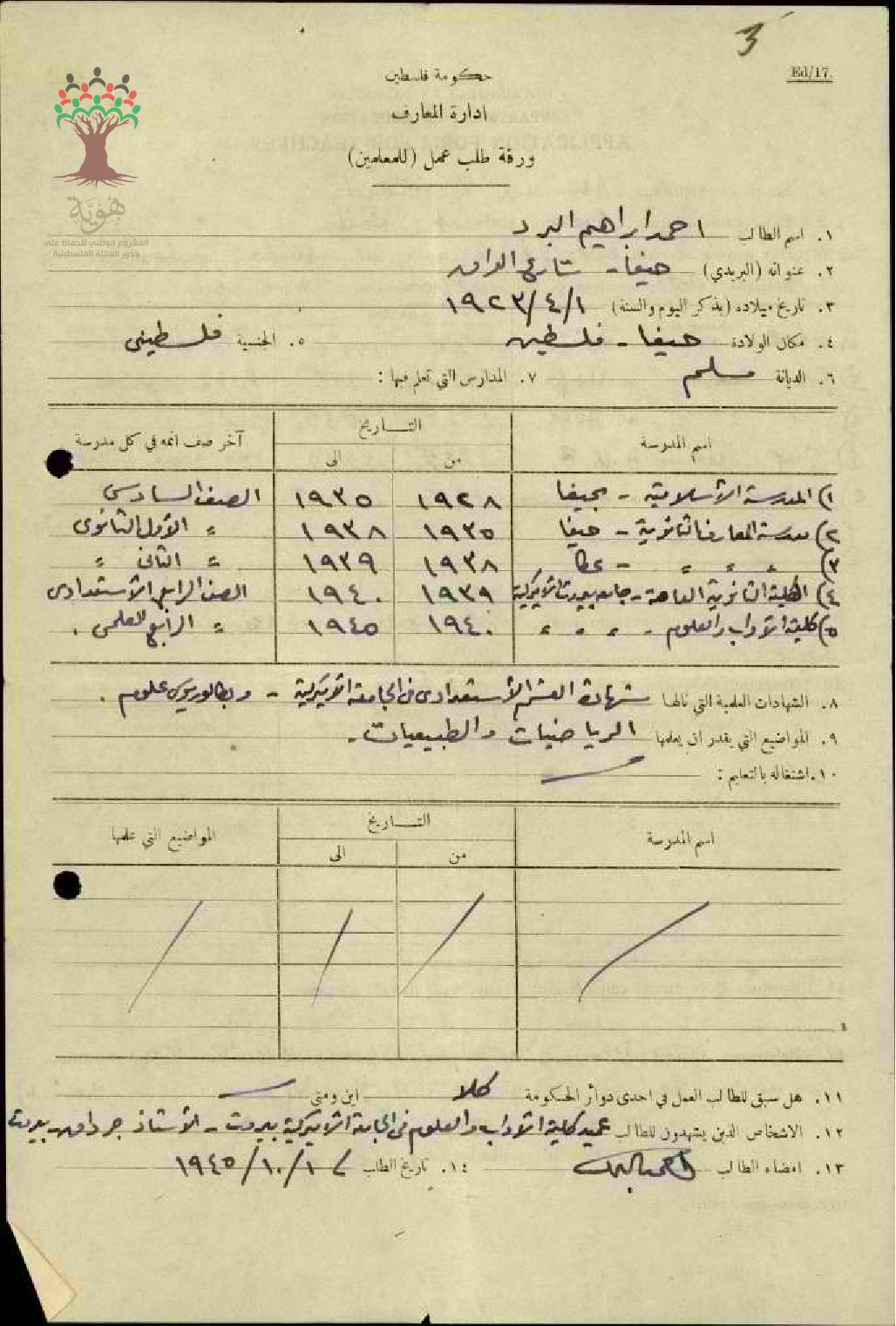 ورقة طلب عمل للمعلم أحمد ابراهيم البرد/حيفا