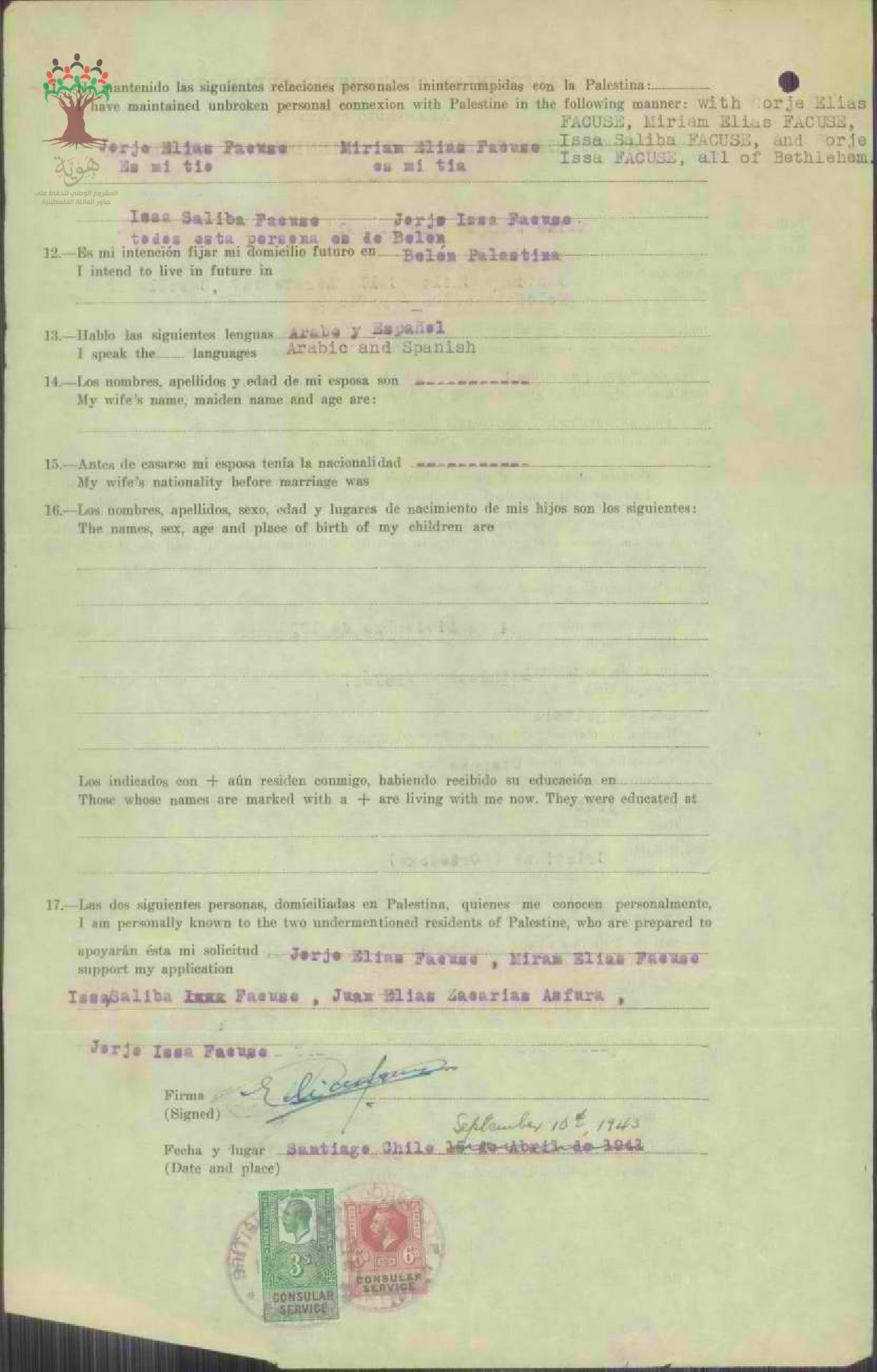 طلب الجنسية الفلسطينية - إلياس حنا (جوان ) فقوسة - بيت لحم / تشيلي