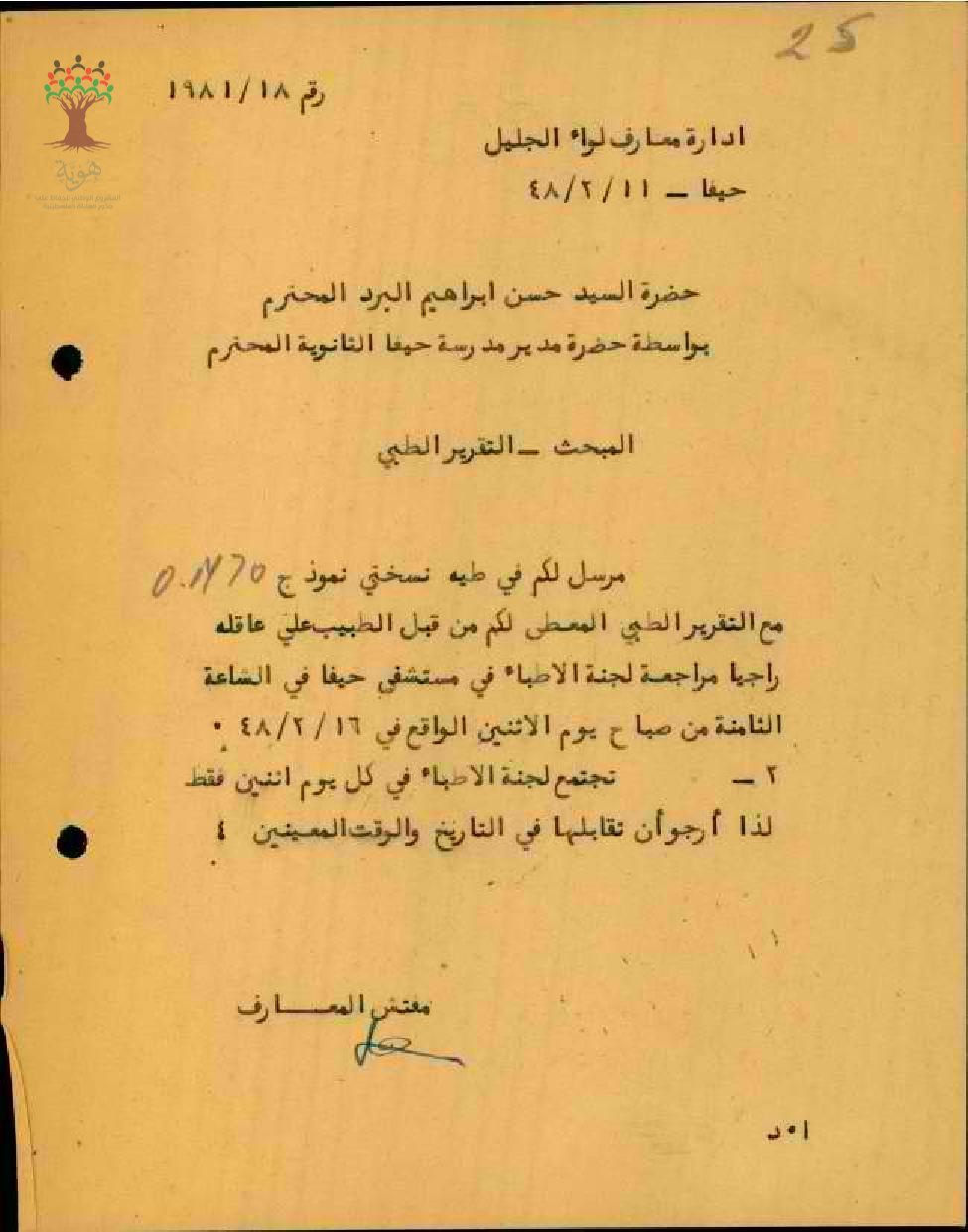 رسالة من مفتش المعارف الى المعلم حسن البرد لمراجعة لجنة الأطباء