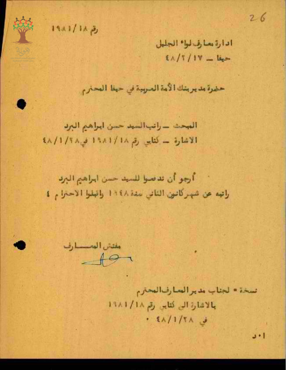 رسالة من مفتش المعارف الى مدير بنك الأمة يطلب منه دفع راتب المعلم حسن البرد