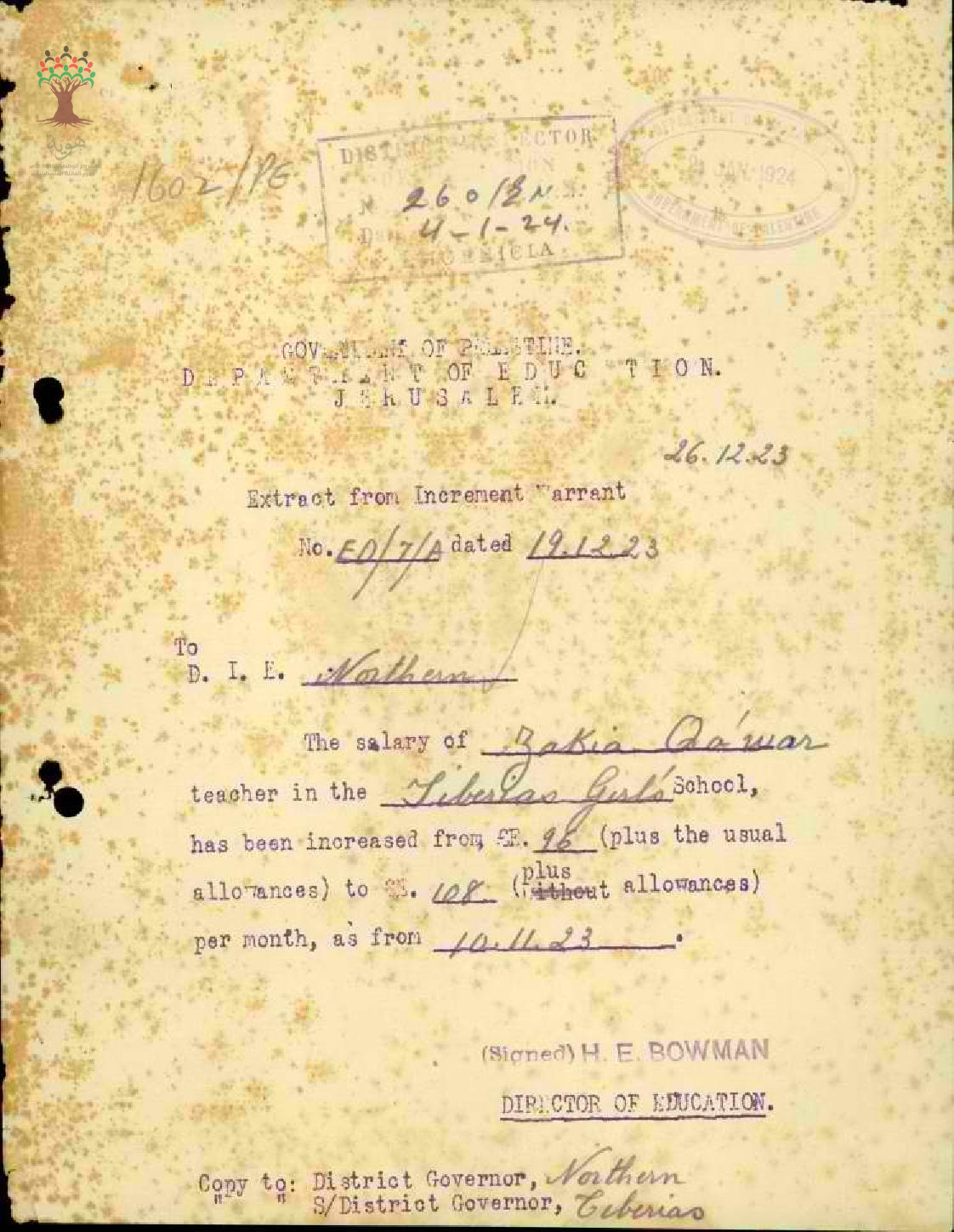 رسالة من مدير المعارف الى مفتش المعارف بخصوص زيادة راتب المعلمة زكية بشارة قعوار السنوية
