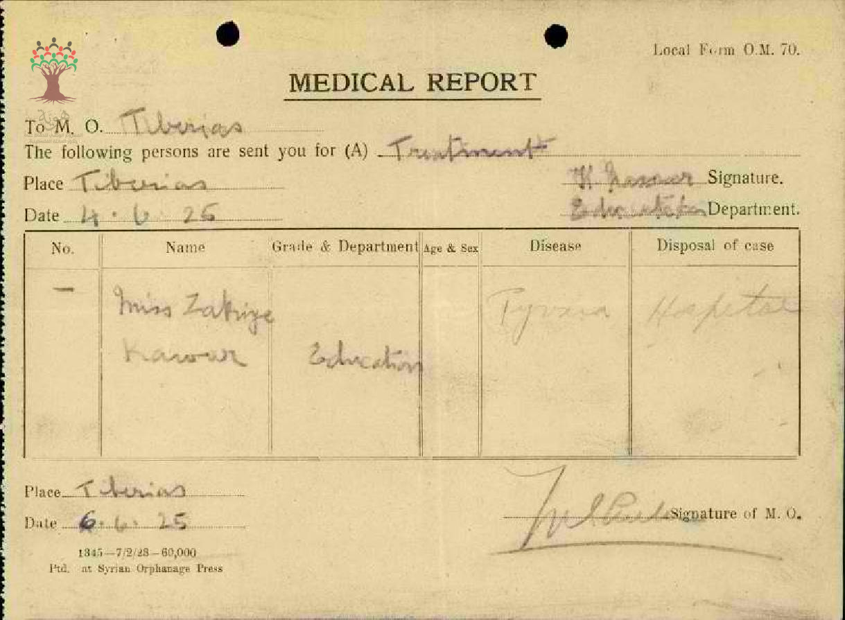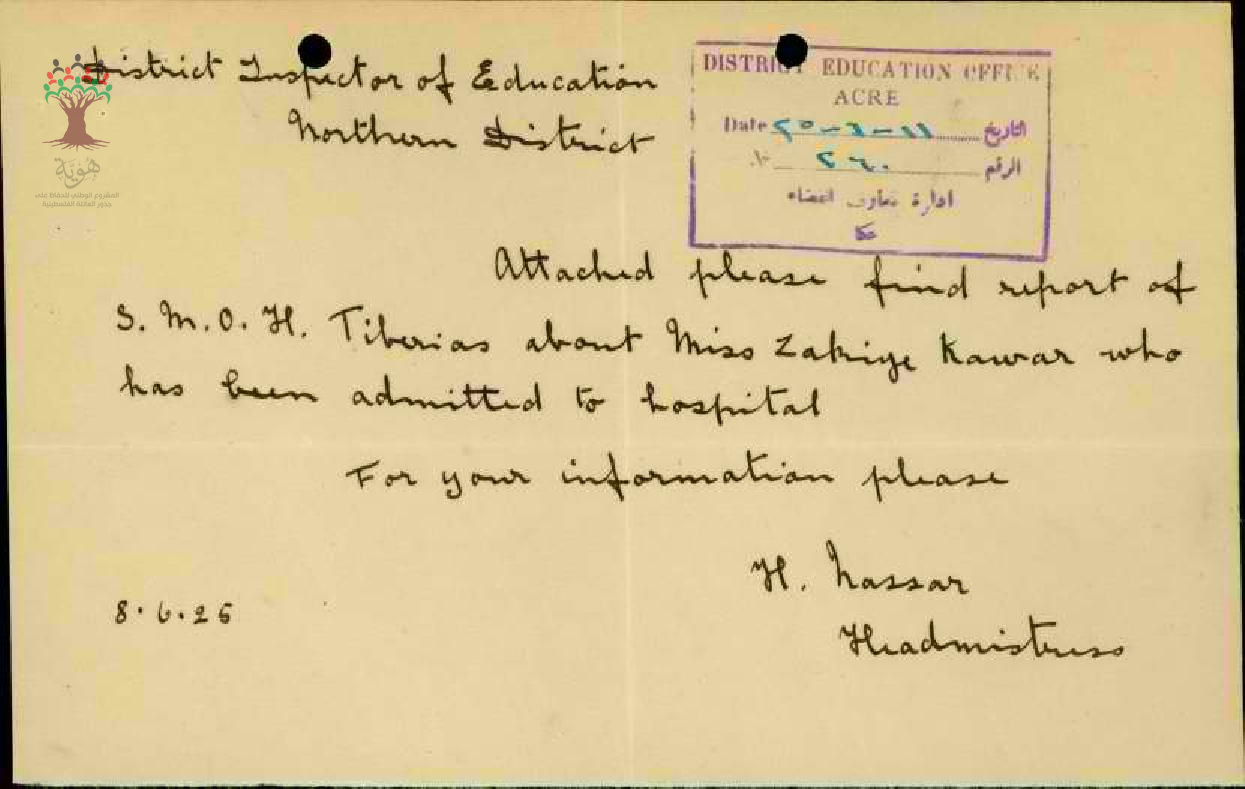 رسالة من مديرة مدرسة طبريا الى مفتش المعارف بخصوص تغيب المعلمة زكية قعوار مرفقة بالتقرير الطبي