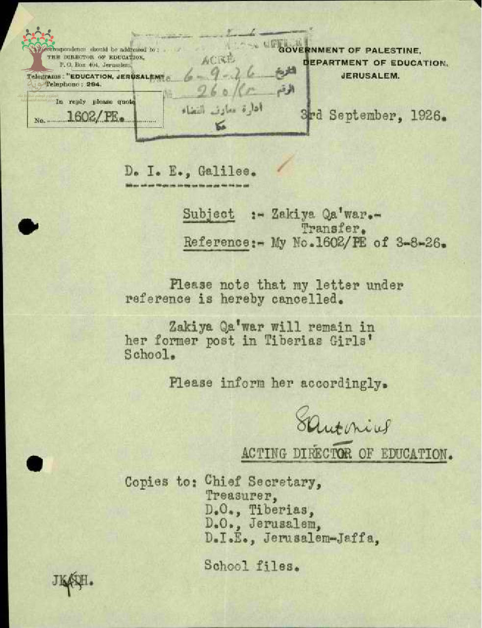 رسالة من مدير المعارف الى مفتش المعارف يخبره بالغاء قرار نقل المعلمة زكية قعوار الى بيت جالا