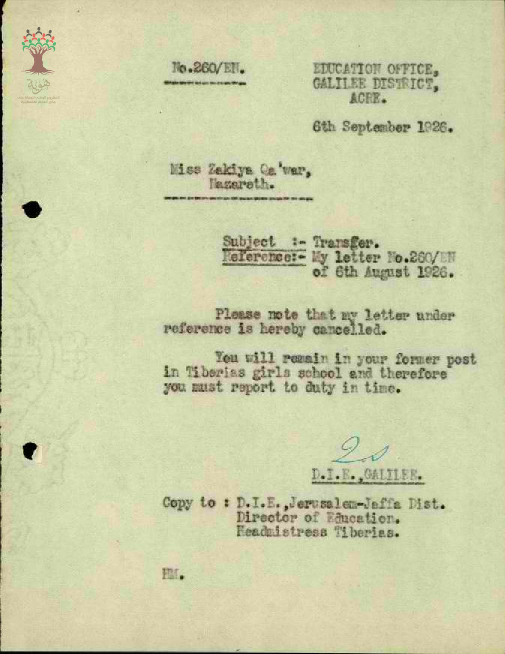 رسالة من مفتش المعارف الى المعلمة زكية قعوار بخصوص بقائها في مدرسة طبريا والغاء قرار نقلها الى بيت جالا