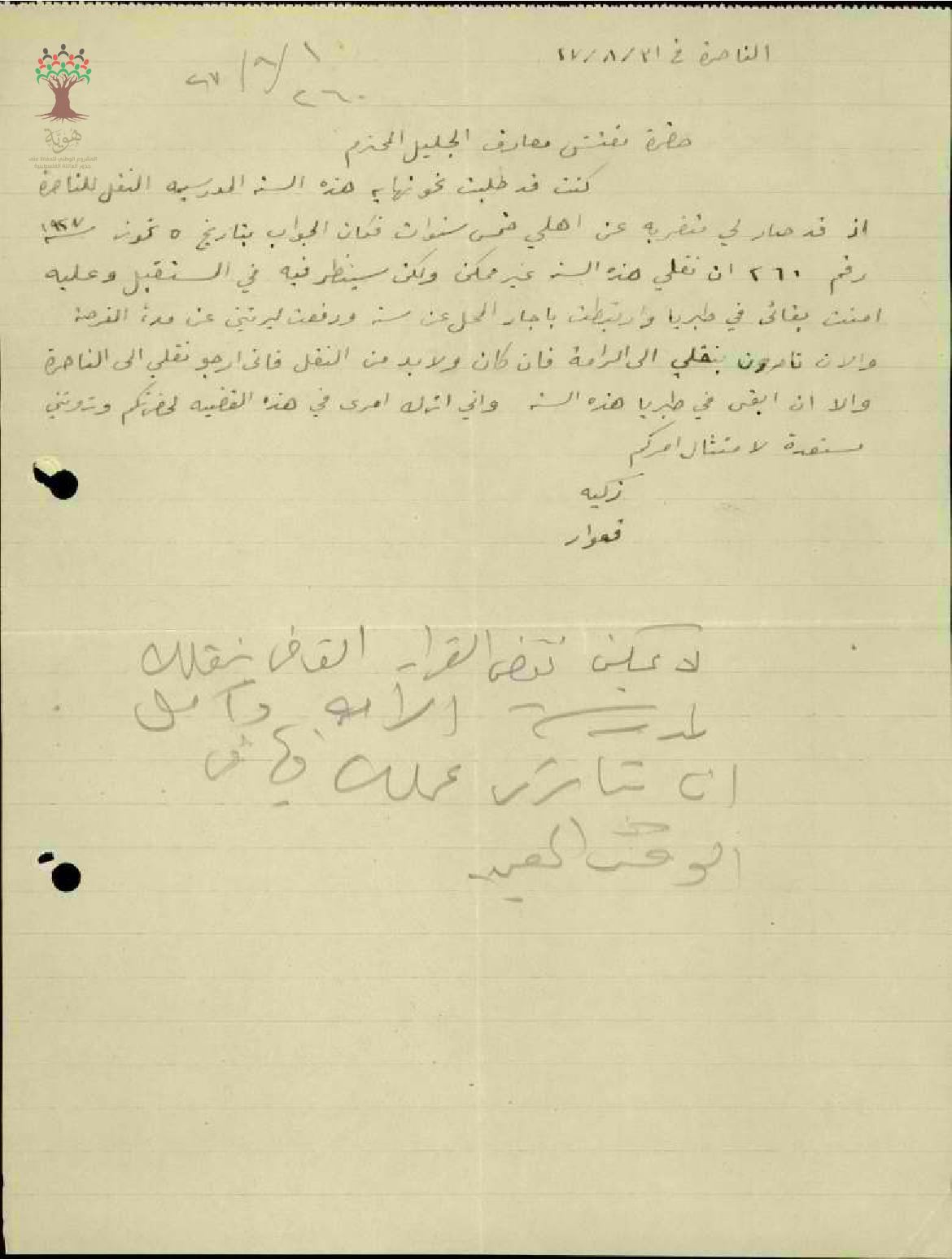رسالة من المعلمة زكية قعوار الى مفتش المعارف تطلب تغيير قرار نقلها من الرامة الى الناصرة
