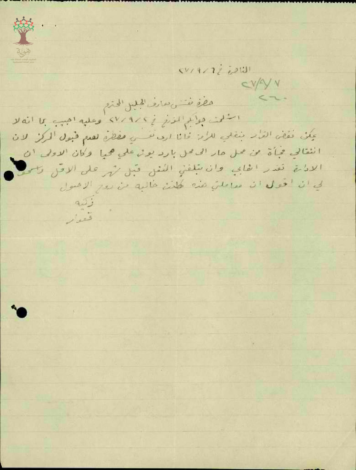 رسالة من المعلمة زكية قعوار الى مفتش المعارف ترفض فيها نقلها الى الرامة