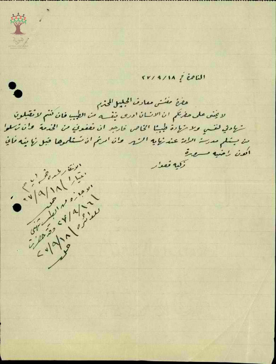 رسالة من المعلمة زكية قعوار الى مفتش المعارف تخبره بأنها تفضل الاستقالة عن الانتقال الى الرامة
