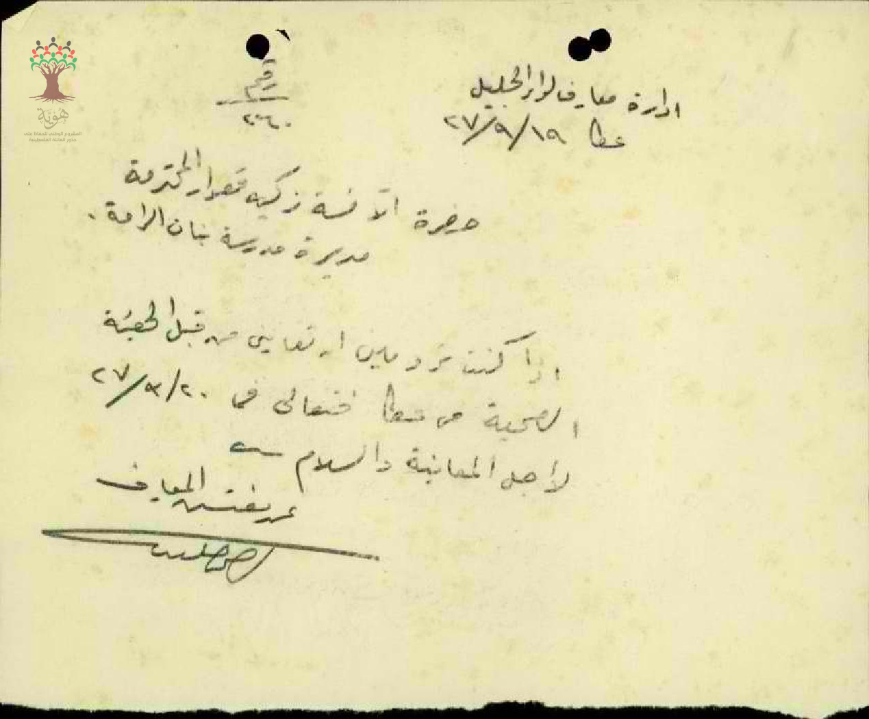 رسالة من مفتش المعارف الى المعلمة زكية قعوار يقترح عليها المعاينة الصحية في عكا