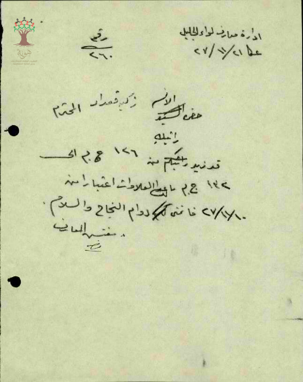 رسالة من مفتش المعارف الى المعلمة زكية قعوار بخصوص زيادة راتبها السنوية