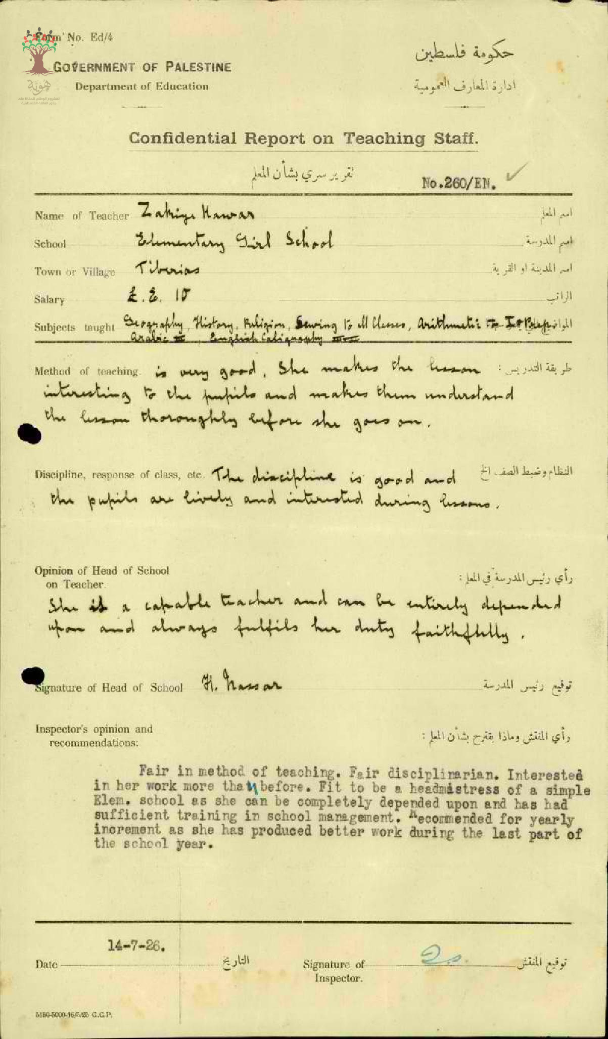 تقرير تفصيلي عن أداء المعلمة زكية بشارة قعوار في مدرسة اناث طبريا سنة 1926