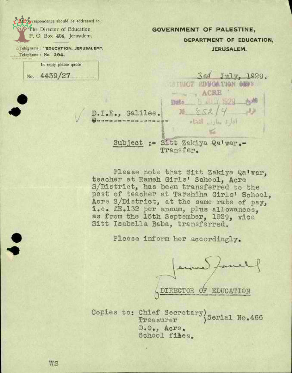 رسالة من مدير المعارف الى مفتش المعارف بخصوص نقل المعلمة زكية قعوار من مدرسة الرامة الى مدرسة ترشيحا