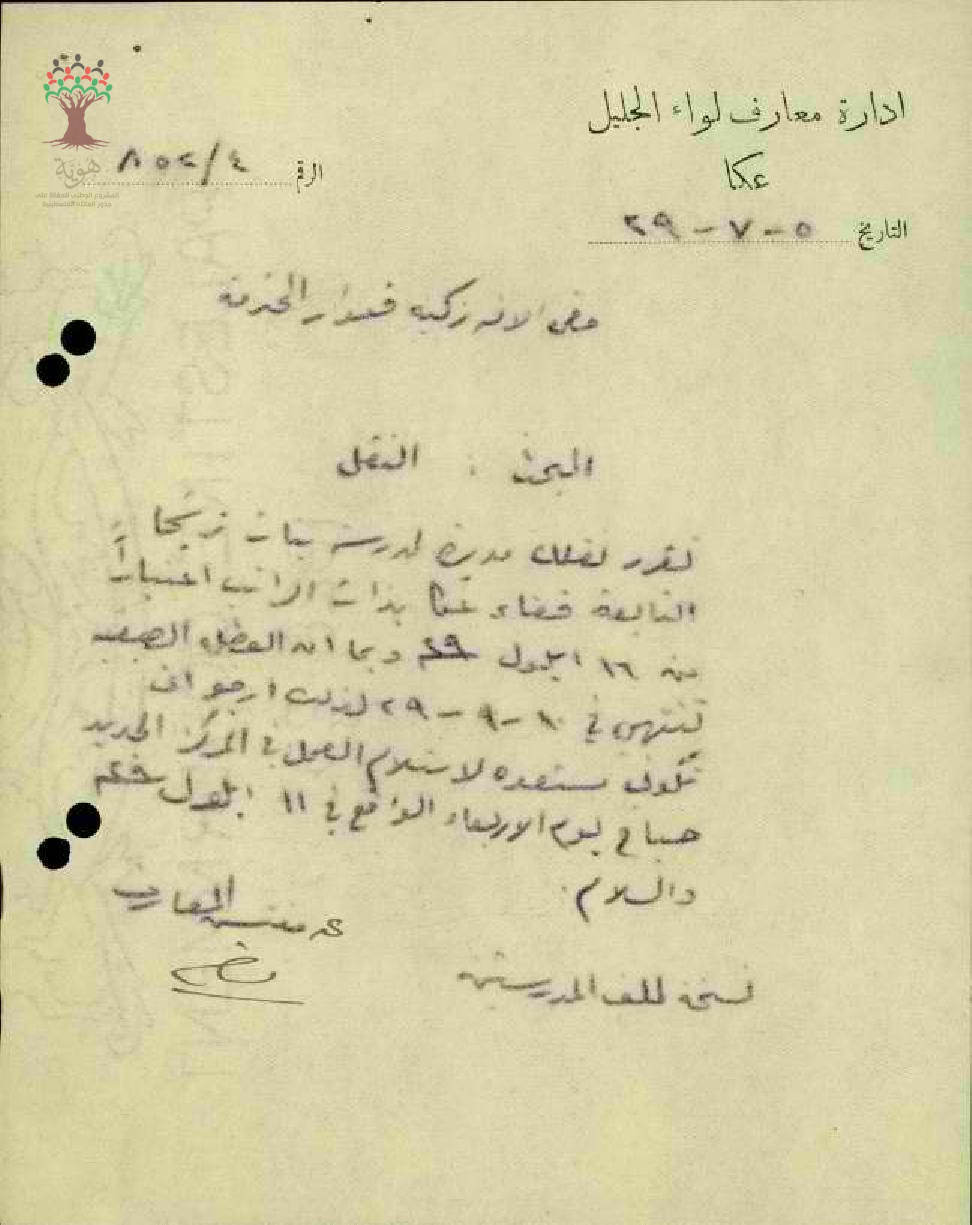 رسالة من مفتش المعارف الى المعلمة زكية قعوار بخصوص نقلها من مدرسة الرامة الى مدرسة ترشيحا