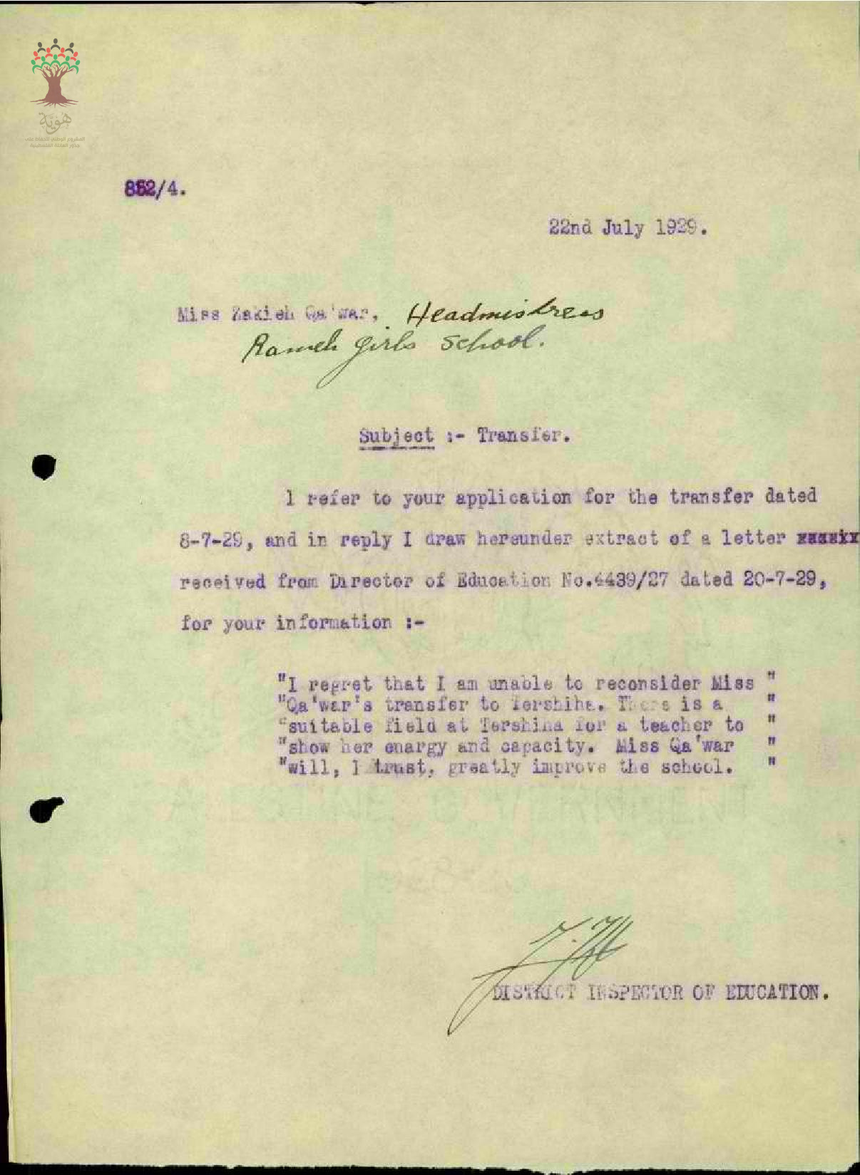 رسالة من مفتش المعارف الى المعلمة زكية قعوار عدم امكانية الغاء نقلها الى ترشيحا