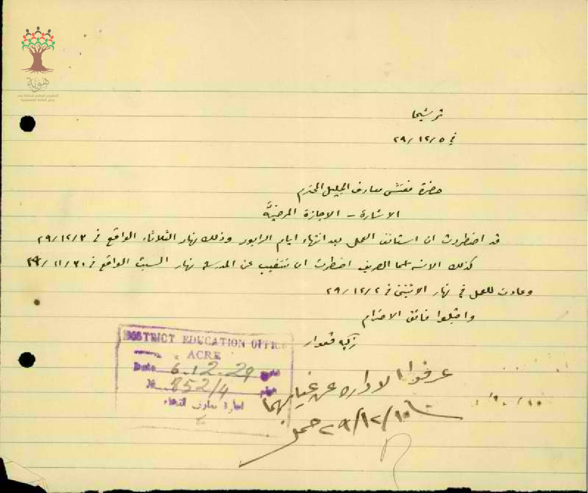 رسالة من المعلمة زكية قعوار الى مفتش المعارف بخصوص تاريخ تغيبها عن العمل