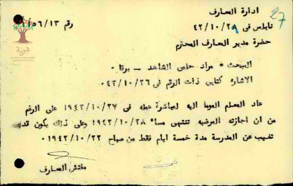 رسالة من مفتش المعارف الى مدير المعارف بخصوص عودة المعلم مراد الشاهد الى العمل