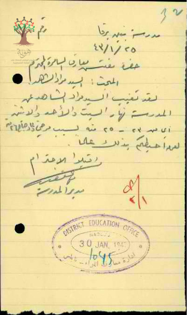 رسالة من مدير مدرسة برقا الى مفتش المعارف بخصوص تغيب المعلم مراد الشاهد