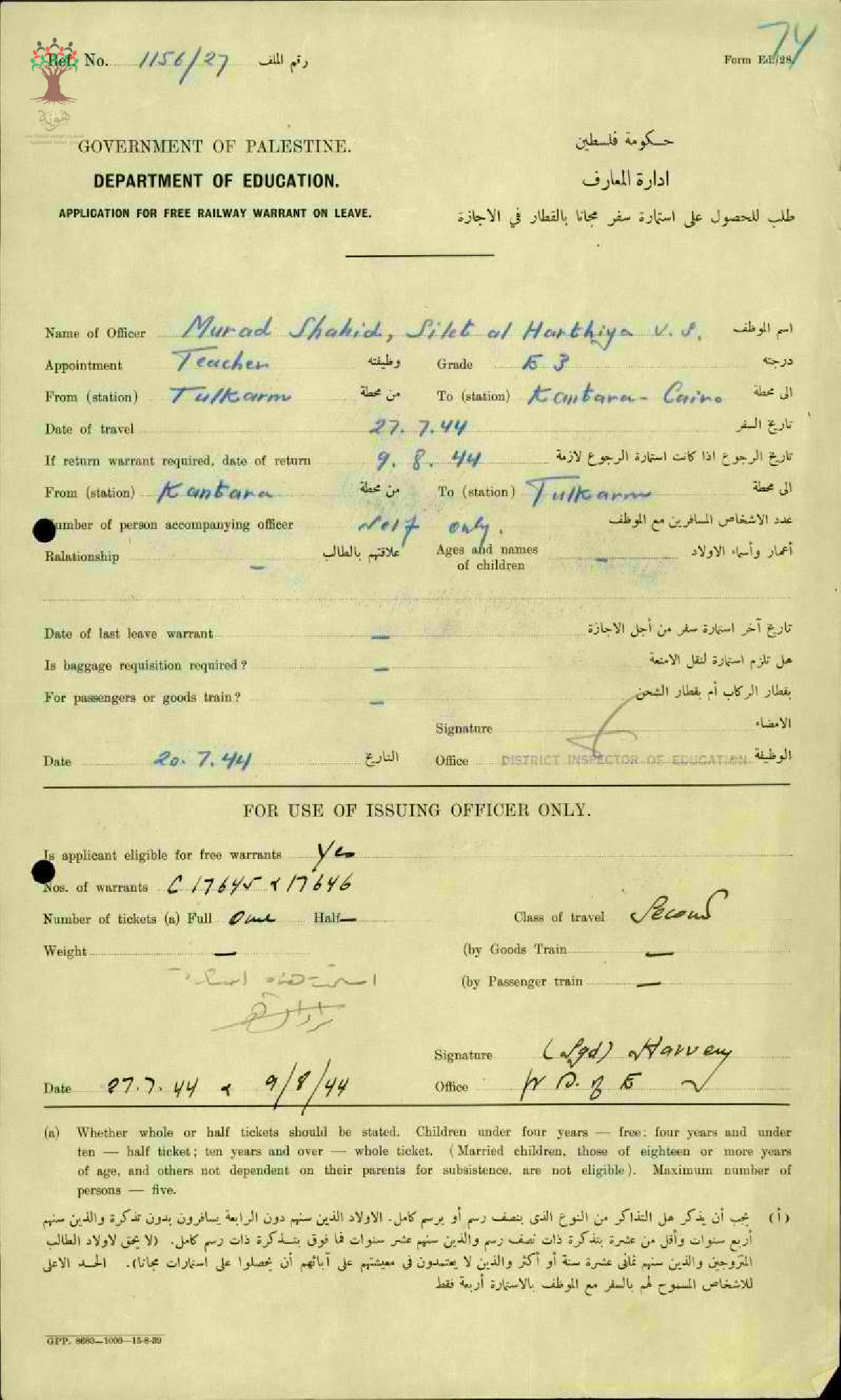 طلب استمارة سفر مقدمة من المعلم مراد الشاهد/نابلس