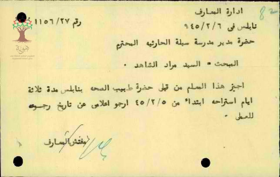 رسالة من مفتش المعارف الى مدير مدرسة سيلة الحارثية يسأل عن موعد عودة المعلم مراد الشاهد الى العمل
