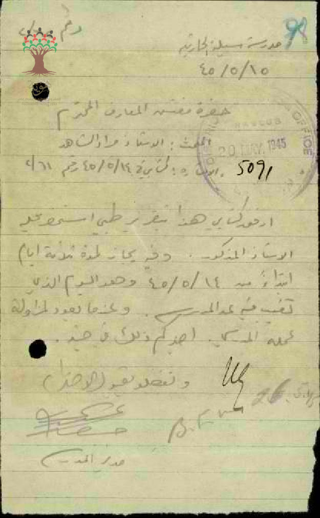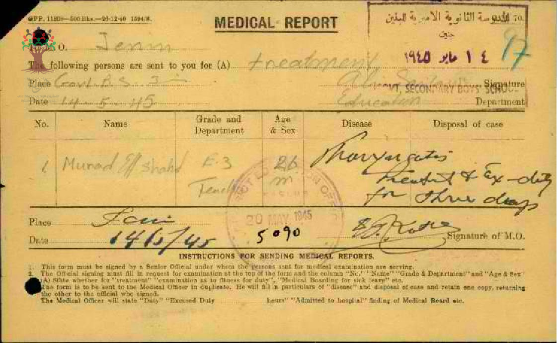 رسالة من مدير مدرسة سيلة الحارثية الى مفتش المعارف بخصوص تغيب المعلم مراد الشاهد مرفقة بالتقرير الطبي