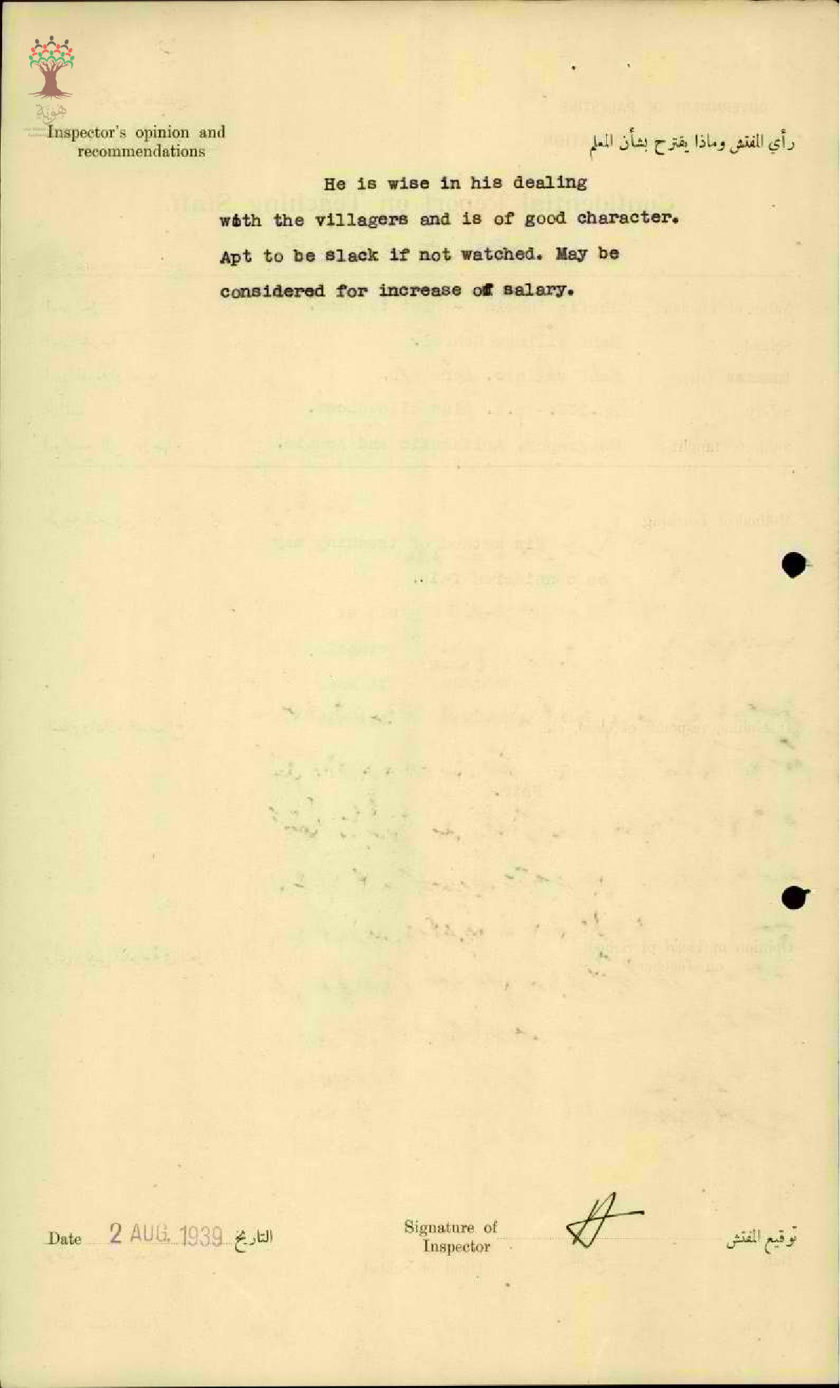رأي المفتش العام بالمعلم شفيق سليم عبيد - عكا - مدرسة نحف