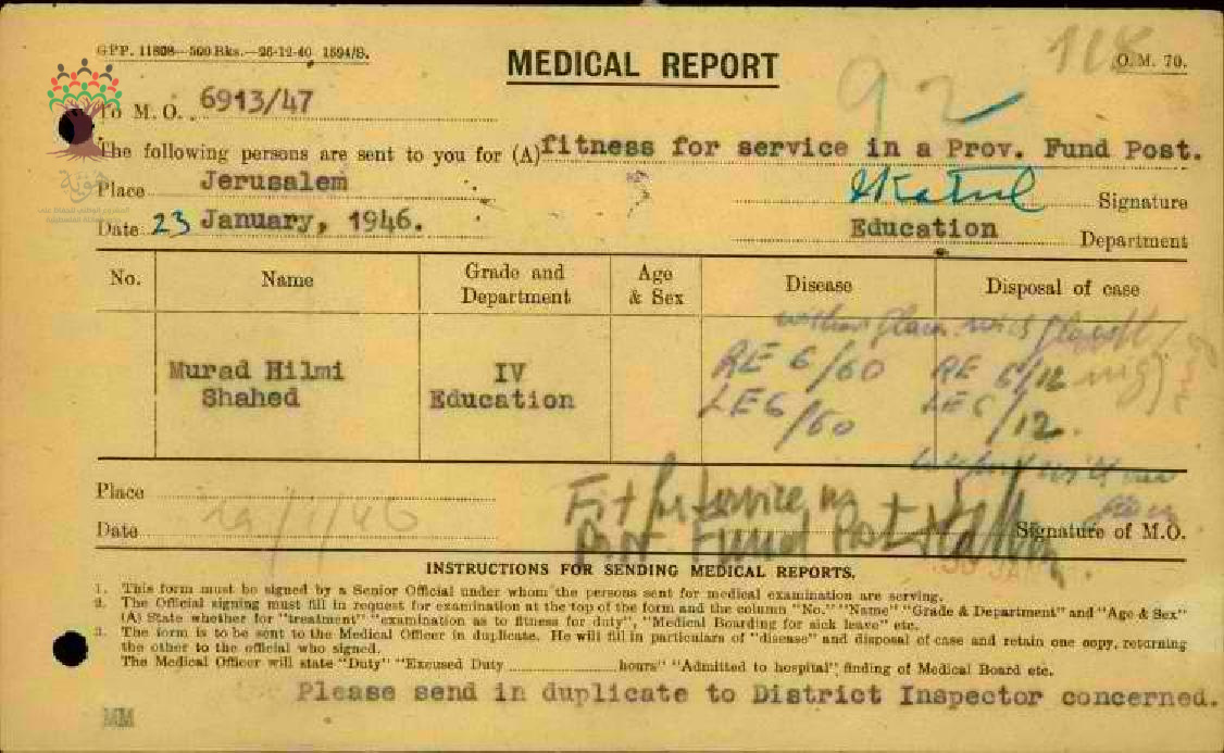 تقرير طبي لتعيين المعلم مراد الشاهد في مدرسة الوحدة العربية