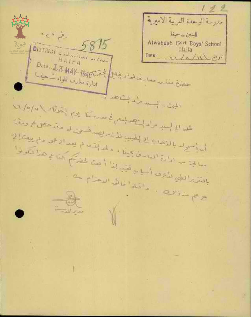 رسالة من مدير مدرسة الوحدة العربية الى مفتس المعارف بخصوص مرض المعلم مراد الشاهد