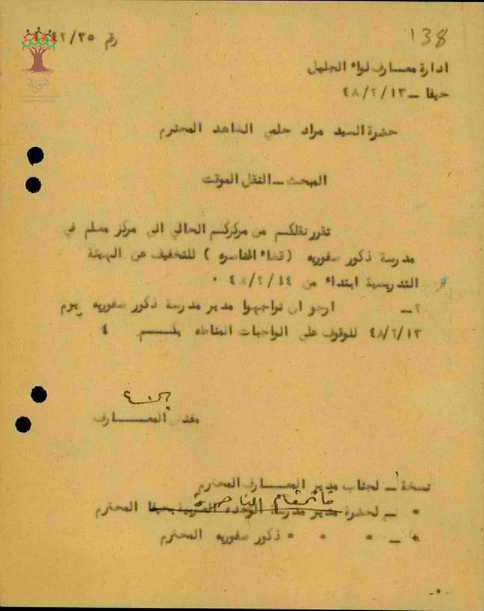 رسالة من مفتش المعارف الى المعلم مراد الشاهد بخصوص نقله مؤقتا الى مدرسة صفورية
