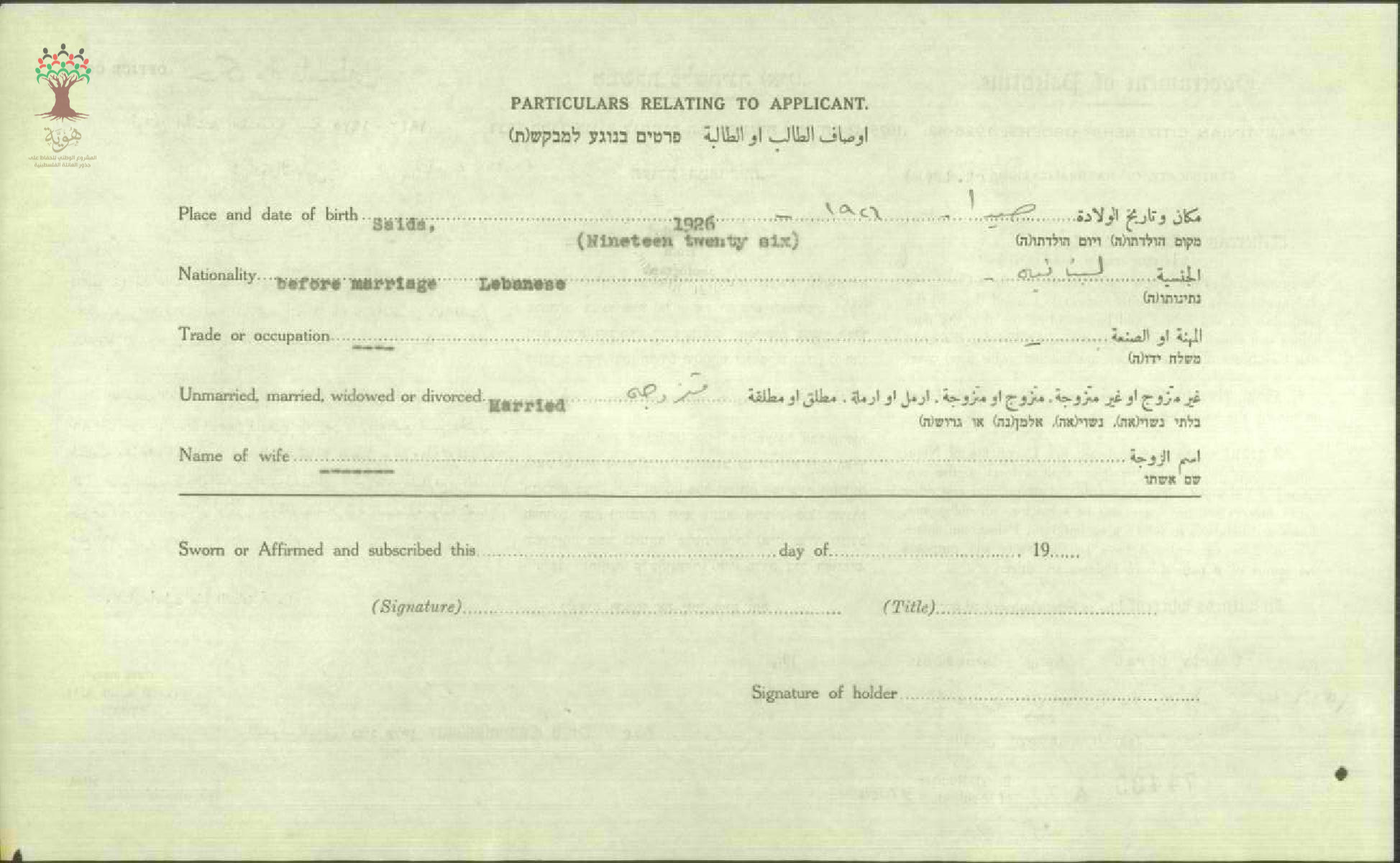 شهادة الجنسية الفلسطينية - زلفى بياري - عكا