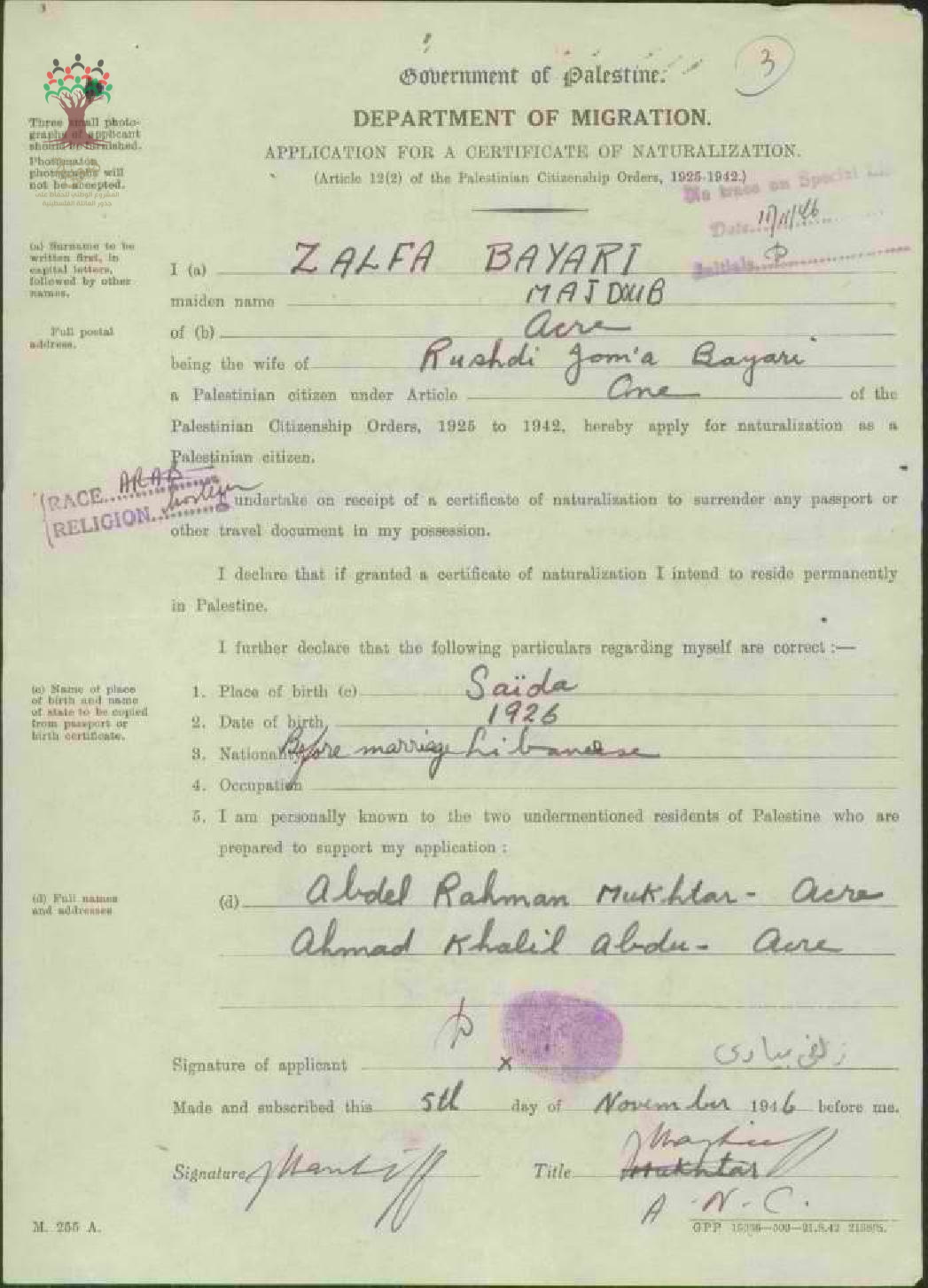 طلب الجنسية الفلسطينية - زلفى بياري - عكا