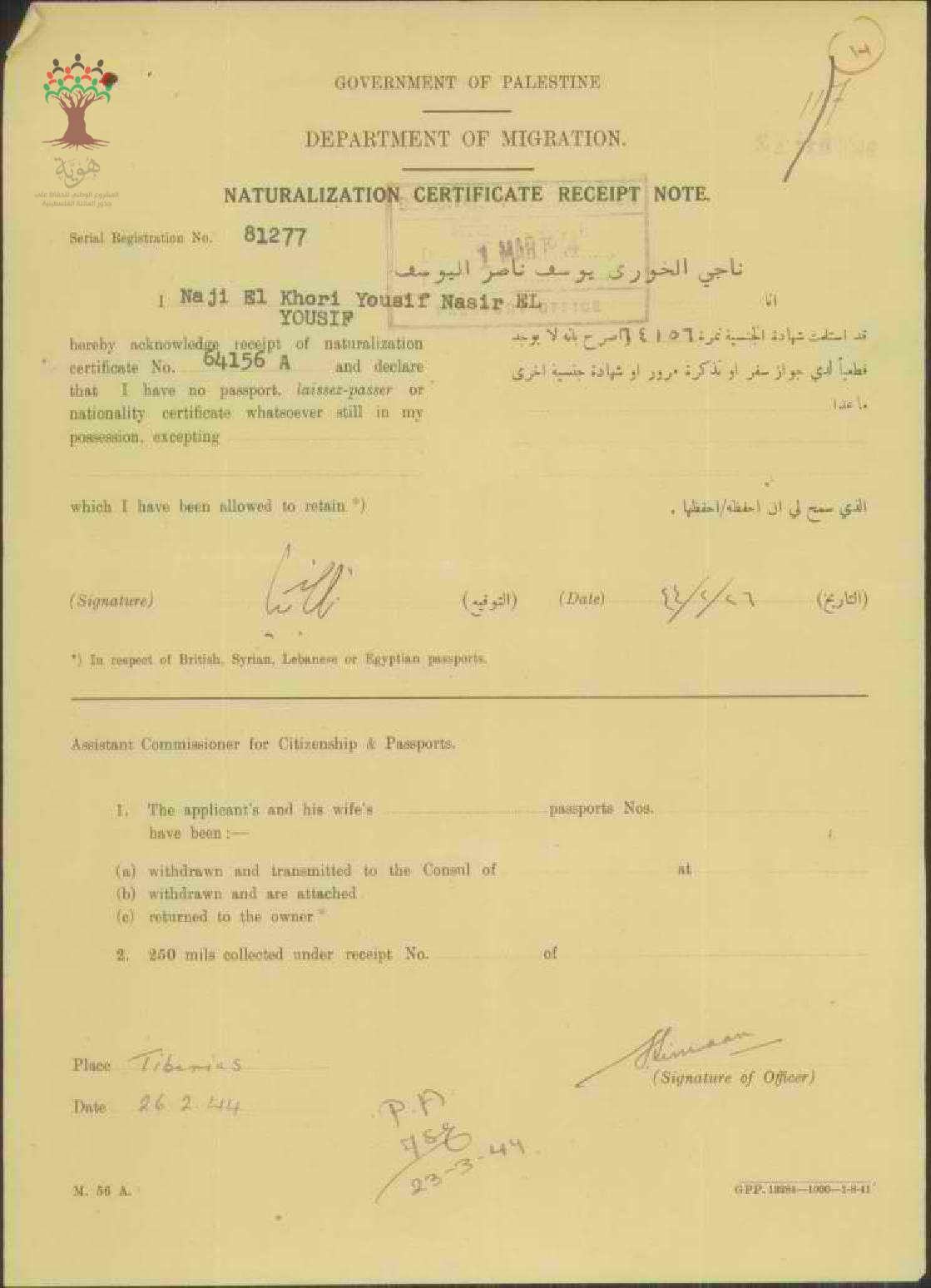 ايصال موقع من ناجي خوري اليوسف باستلام شهادة الجنسية الفلسطينية