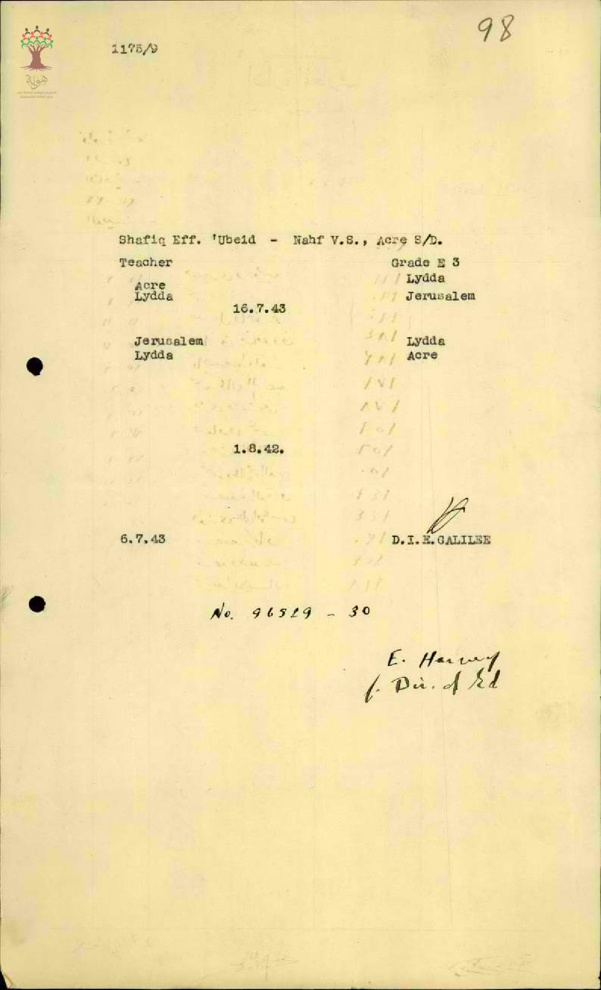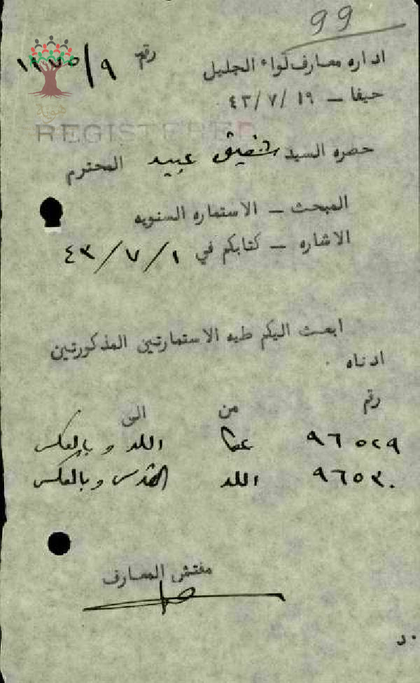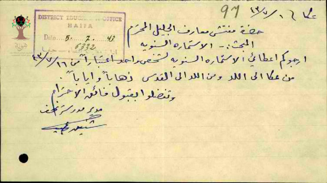 استمارة سفر من عكا الى اللد للمعلم شفيق سليم عبيد - عكا - مدرسة نحف