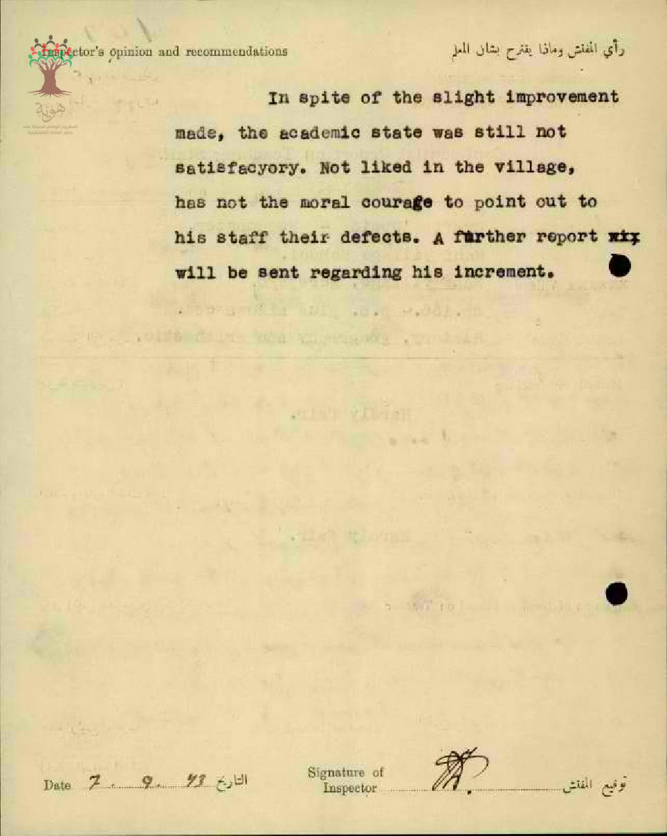 رأي المفتش العام بالمعلم شفيق سليم عبيد - عكا - مدرسة نحف