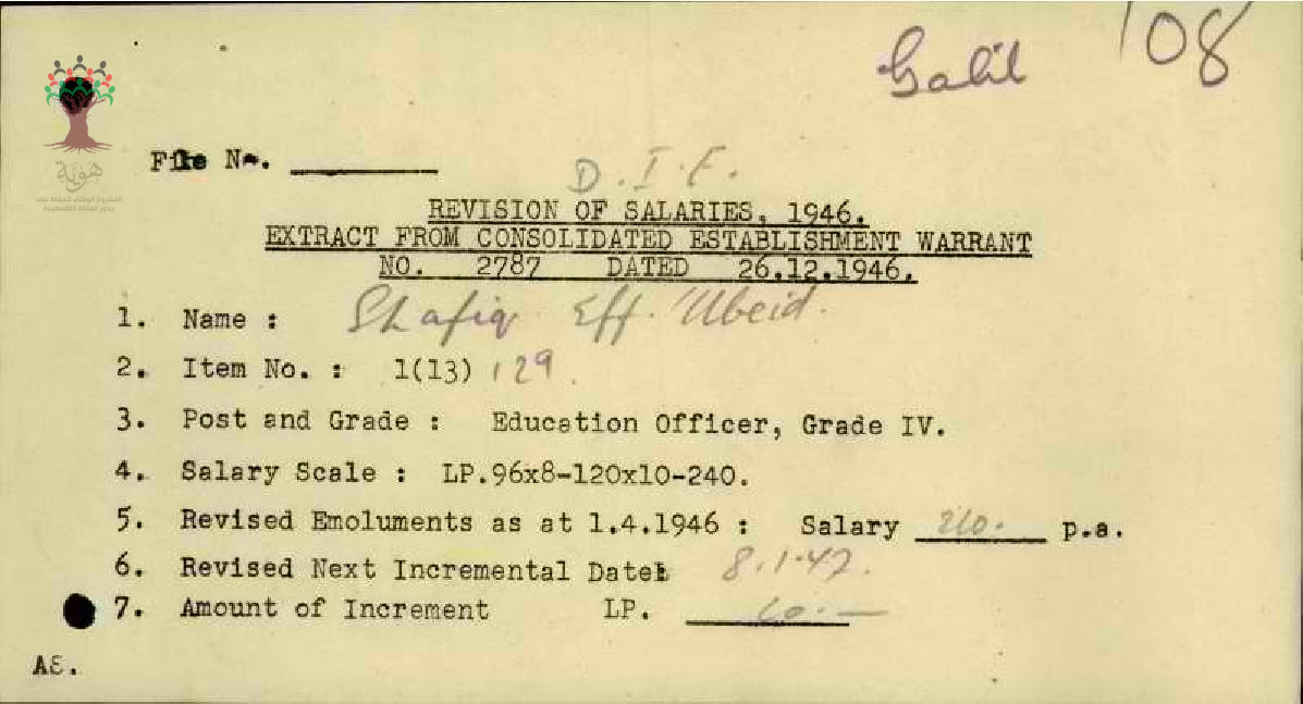 زيادة مرتب المعلم شفيق سليم عبيد - عكا - مدرسة الدامون