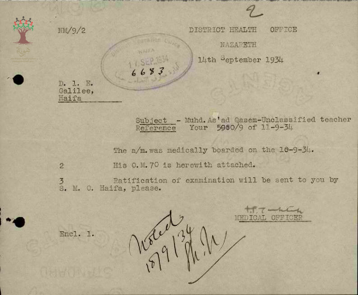 رسالة من طبيب ادارة المعارف الى مفتش المعارف بخصوص تقرير تعيين المعلم محمد أسعد قاسم