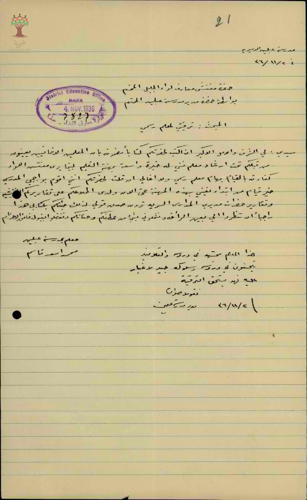 رسالة من المعلم محمد قاسم الى مفتش المعارف يطلب فيها ترقيته الى معلم رسمي في الدرجات النظامية