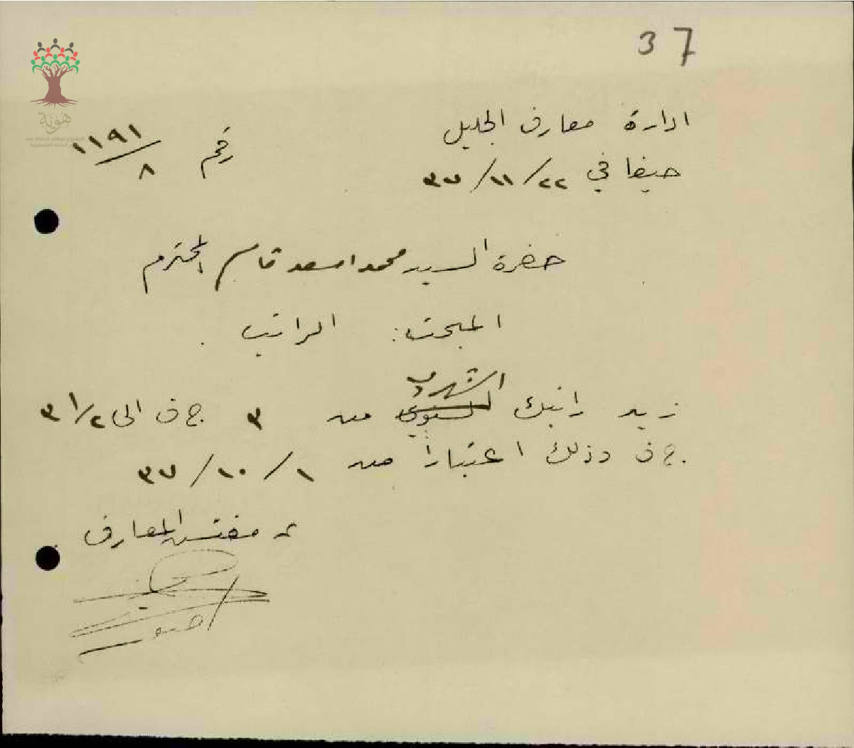 رسالة من مفتش المعارف الى المعلم محمد قاسم بخصوص زيادة راتبه السنوية