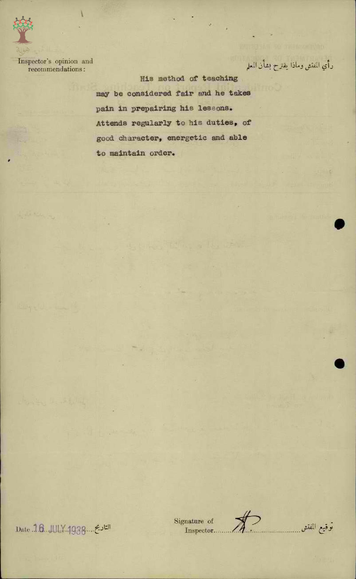 تقرير تفصيلي عن أداء المعلم محمد أسعد قاسم في مدرسة عبلين الأميرية سنة 1938