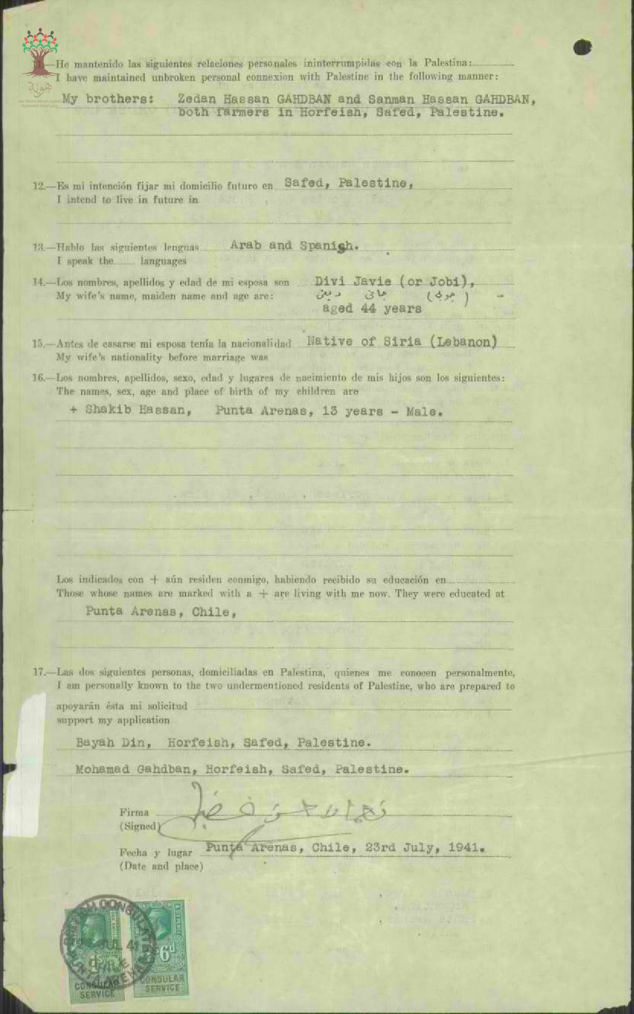 طلب الجنسية الفلسطينية - نعمان حسن الغضبان - حرفيش / تشيلي