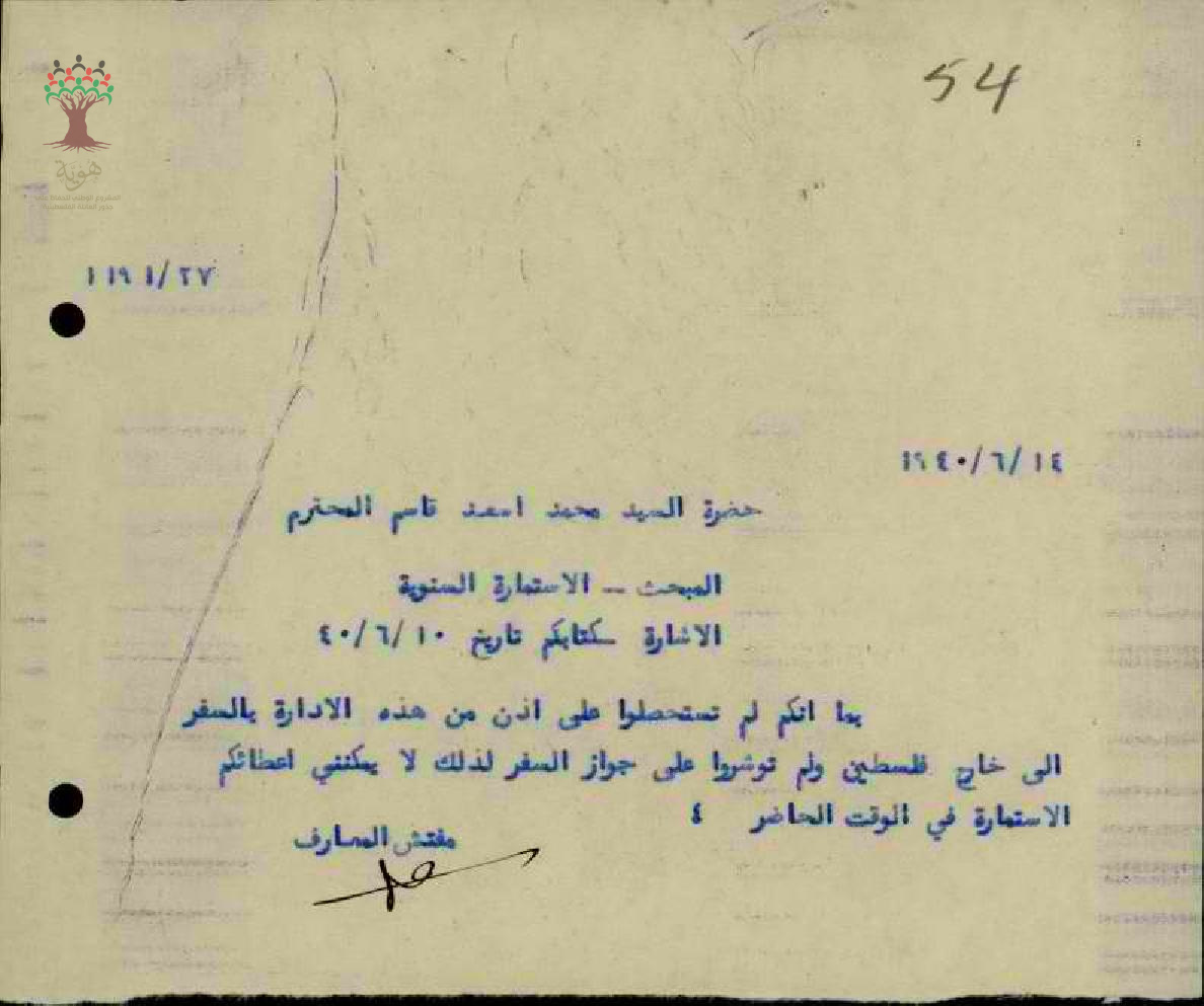 رسالة من مفتش المعارف الى المعلم محمد قاسم بخصوص عدم اعطائه استمارة سفره السنوية لأنه لم يطلب اذن للسفر