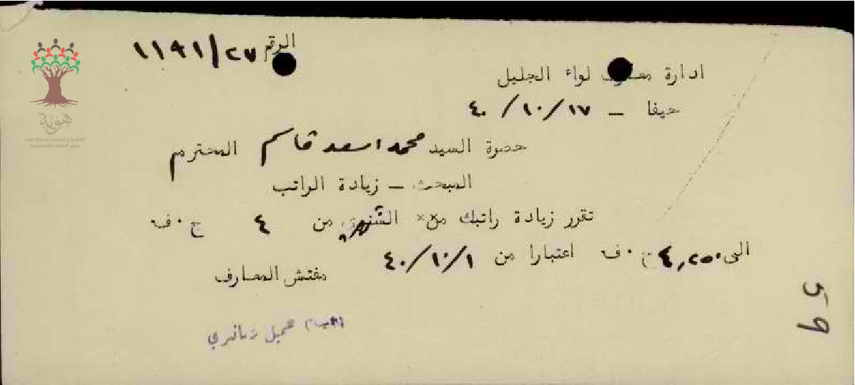 رسالة من مفتش المعارف الى المعلم محمد قاسم بخصوص زيادة راتبه السنوية