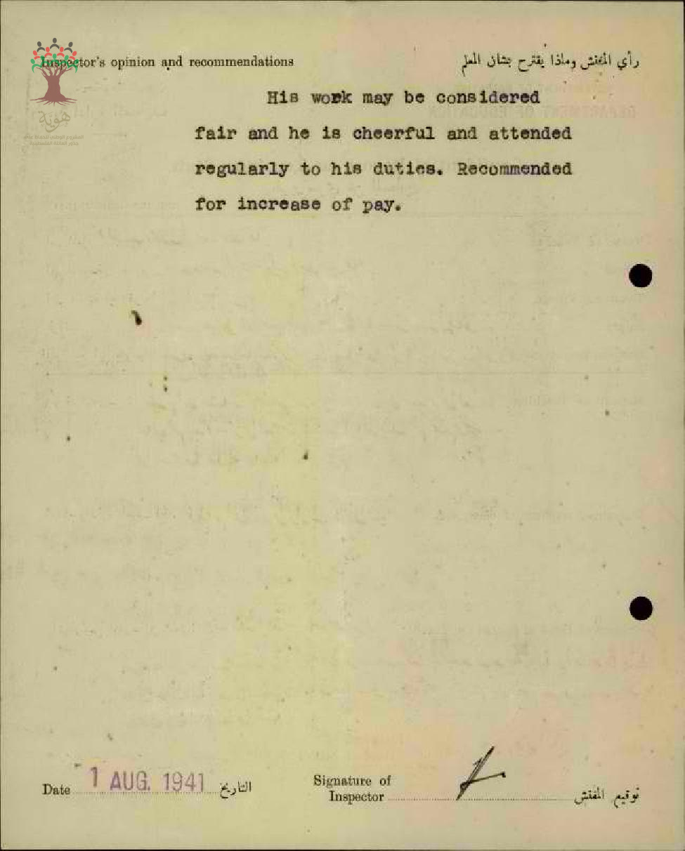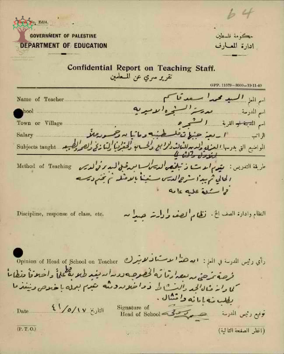 تقرير تفصيلي عن أداء المعلم محمد أسعد قاسم في مدرسة الشجرة الأميرية سنة 1941