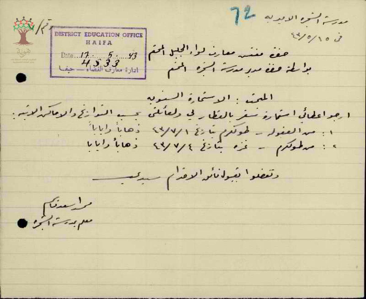 رسالة من المعلم محمد قاسم الى مفتش المعارف يطلب فيها استمارة سفره السنوية