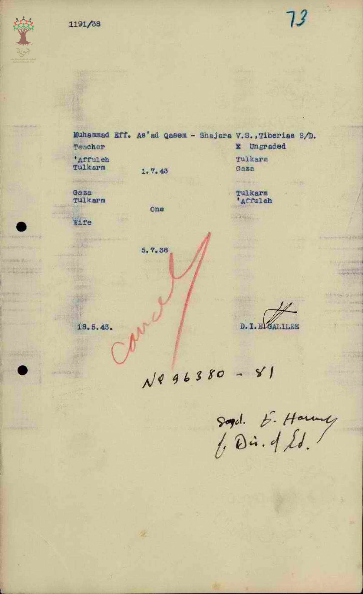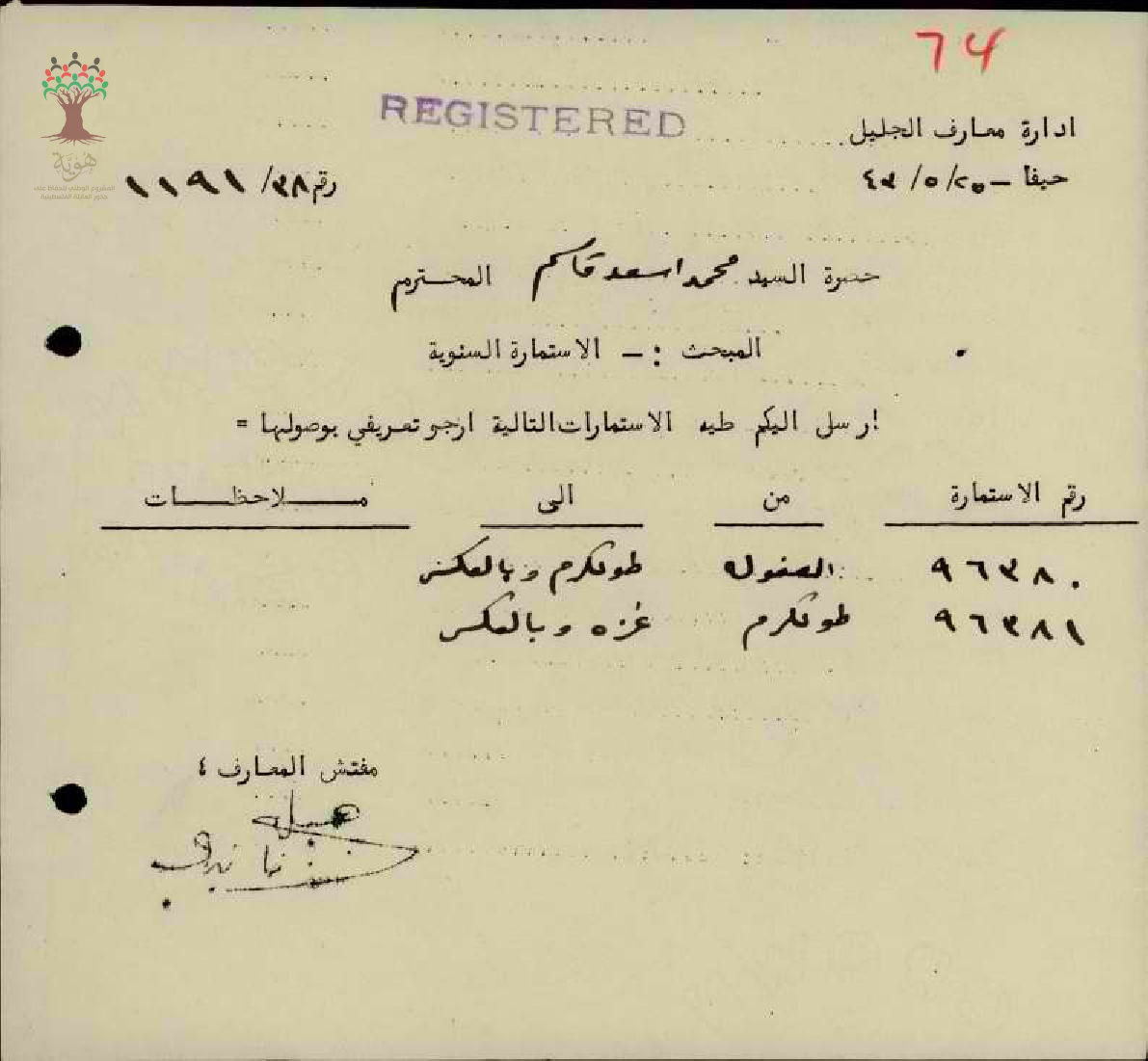 رسالة من مفتش المعارف الى المعلم محمد قاسم مرفقة باستمارة سفره