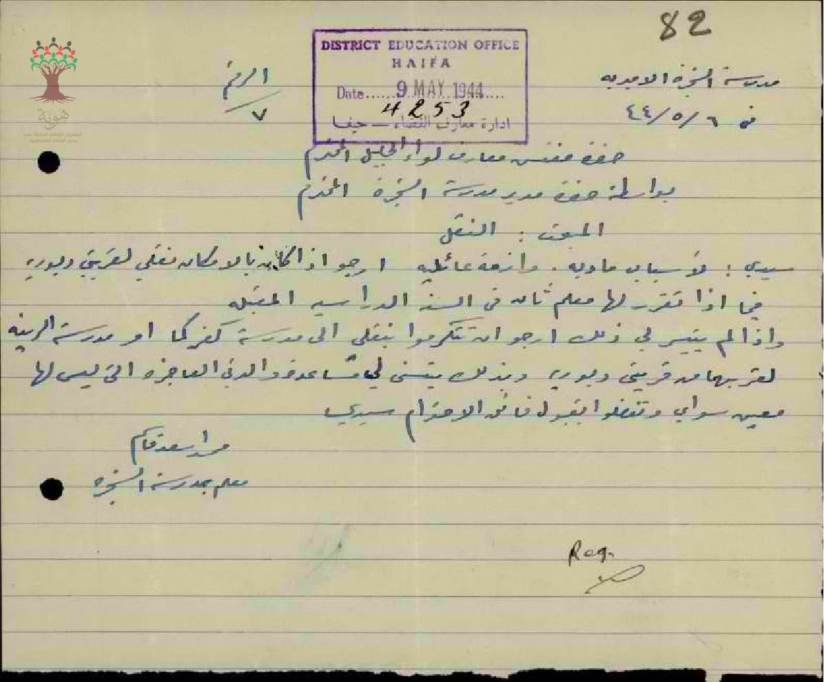 رسالة من المعلم محمد قاسم الى مفتش المعارف يطلب فيها نقله من مدرسة الشجرة