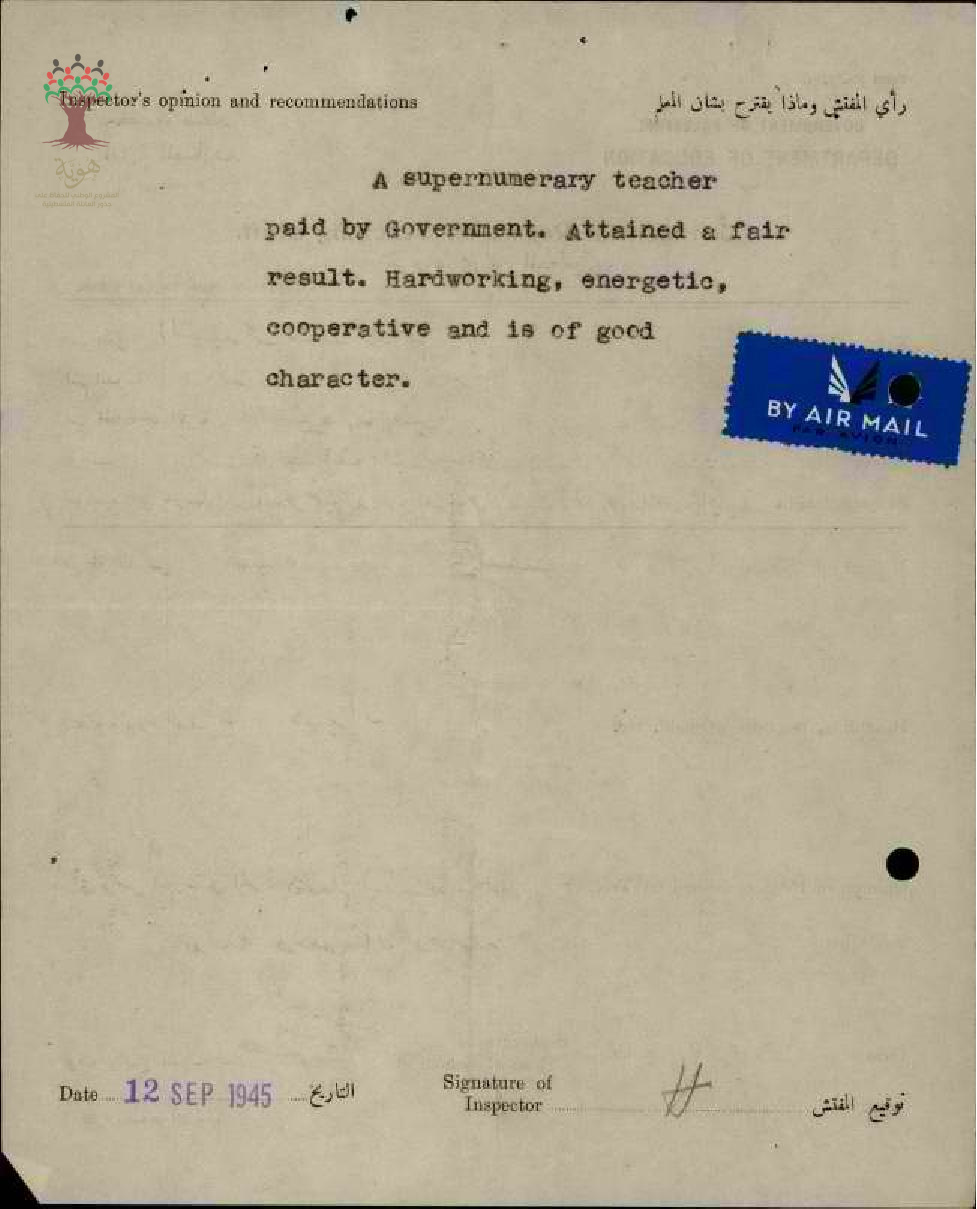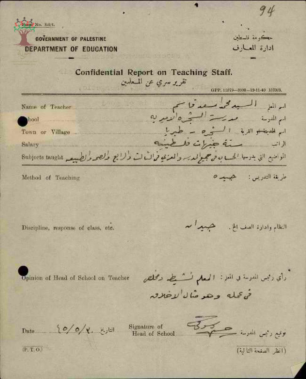 تقرير تفصيلي عن أداء المعلم محمد أسعد قاسم في مدرسة الشجرة الأميرية سنة 1945