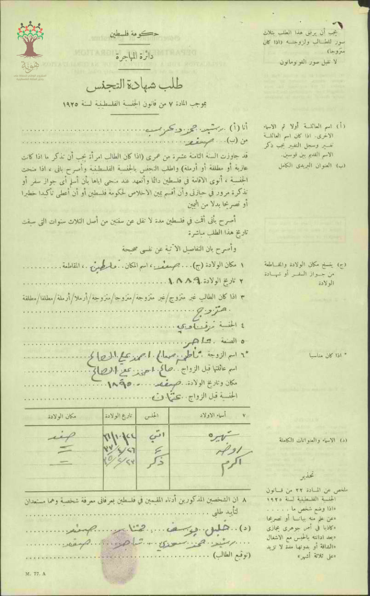 طلب الجنسية الفلسطينية - رشيد عرب - صفد / الجزائر